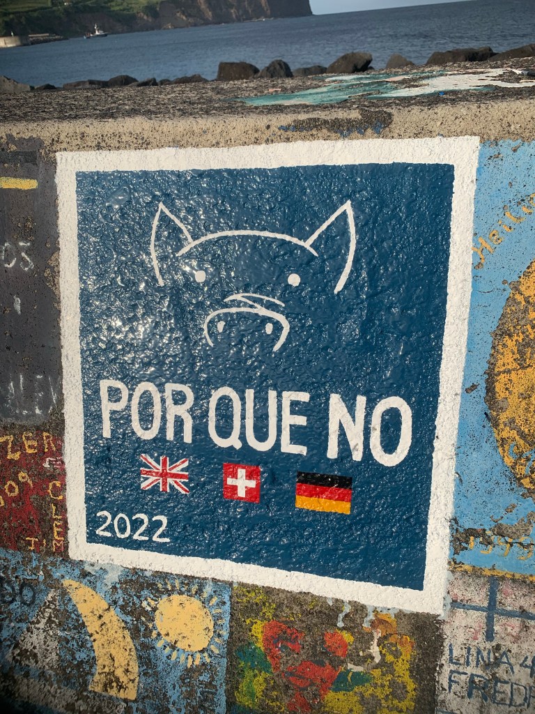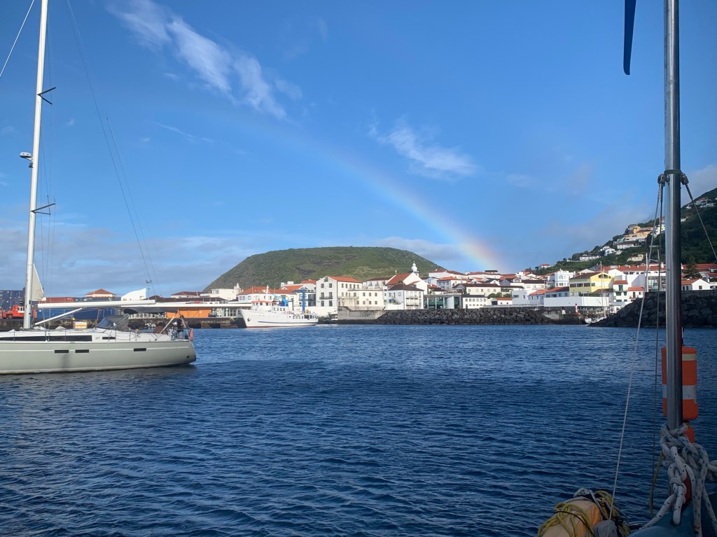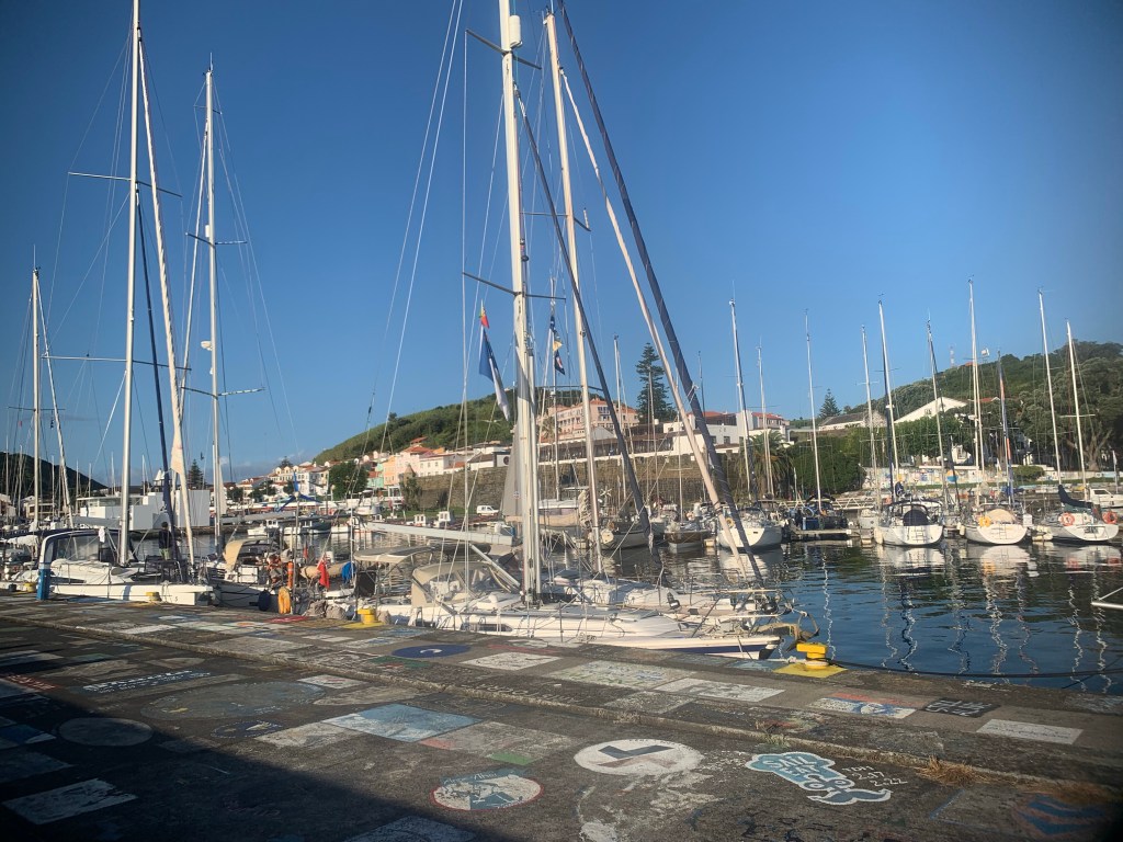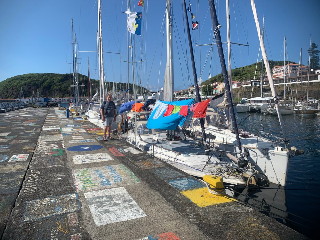 The next island along is Faial with the main harbour of Horta the major stopping place for boats heading back east across the Atlantic. Less than 25 miles from Velas it was a motor most of the way, just a short period with enough wind to sail. When we were last here it was 2020, the COVID year, and we were sailing back from the Caribbean. Luckily for us the authorities started allowing yacht people ashore after getting a negative covid test just the week before we arrived (prior to that boats had to anchor off and supplies were brought to them) so we were able to spend nearly 2 weeks exploring the island. In 2020 the harbour was full of yachts but very peaceful ashore as there were no flights, now its Sea Week in Horta, lots of yacht races, dinghy races, rowing races, swimming races and music (and of course a full complement of tourists) so it’s pretty busy though paradoxically probably less itinerant yachts. We were lucky enough to be allocated a berth on the wall in the marina.