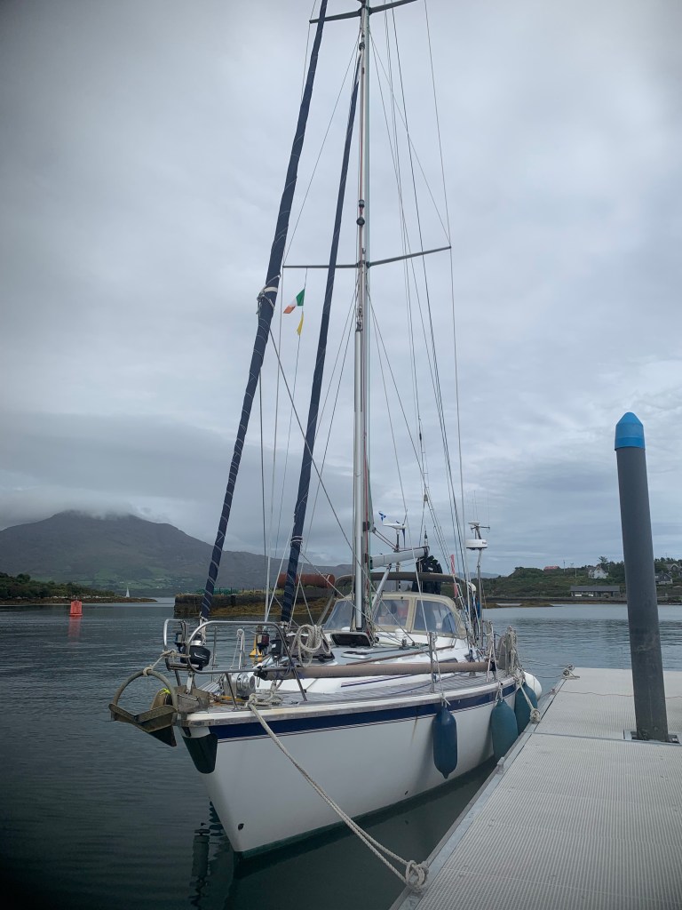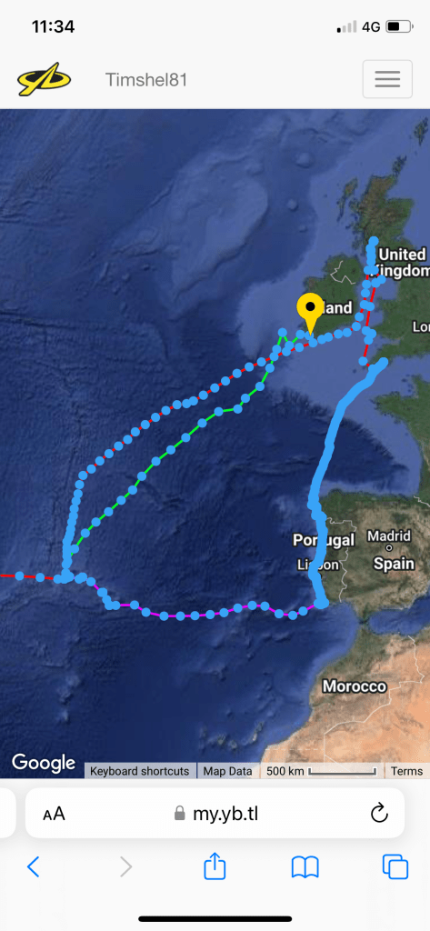 We left Horta on 26th August finally bound for home – we’d been delayed nearly 2 weeks due to getting Covid and missing our weather slot. “Mid August” had turned into “nearly September” and it was starting to feel quite autumnal. We set off with grey sky and a lumpy sea on a close reach. We saw (usually just on the AIS) about one ship per day and we actually saw and spoke to (on VHF) one other yacht, a French guy sailing solo (apart from the cat) and heading for Brest. As expected, we had to use the engine on a couple of days to get through light wind high pressure areas. We had one day of nice downwind sailing. What we didn’t expect further on in the passage was to get persistent NE winds (coming from exactly where we wanted to go) instead of the expected prevailing westerlies. At one point we seemed to have a choice between heading towards Iceland or Brest! We realised there was no way we could make Cork and decided to aim for Bantry Bay instead. Hard on the wind in a big sea we were taking a bit of a battering, too much sail and the side deck would be under water, too little and we’d be stopped and every so often the boat would hit a wave head on and it would come crashing over the cabin top and down the ventilators and hatches. Luckily at least our off watch bunk was comfortable even under these conditions. Slowly we got closer to Ireland. 2 days out we started to see fishing boats and the VHF radio came to life with broadcasts from Irish Coast stations. We had seen hardly any wildlife, just Shearwaters seemed to be there most of the way. On our 2nd to last day a tiny bird flew into the cockpit and stayed a short while perching under the spray hood. It didn’t seem too impressed with our offerings of breakfast cereal, but wasn’t at all frightened of me. Apparently it was a Willow Warbler (thanks Jayne). As we closed the coast we started to see Fulmars, then gulleimots and gannets, and dolphins. Finally after 11 days and 2 hours we were able to sail up Bantry Bay to Bere island and the little marina at Lawrence Cove. A lovely calm and peaceful place and the sun came out! N.B. The phone came to life as we sailed up Bantry Bay – 474 unread emails!