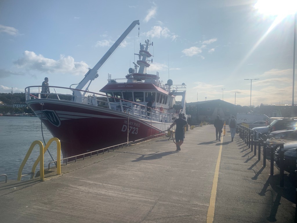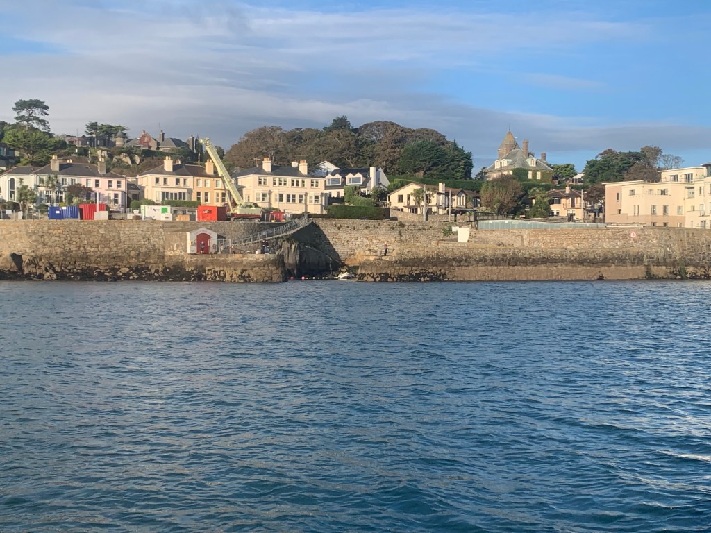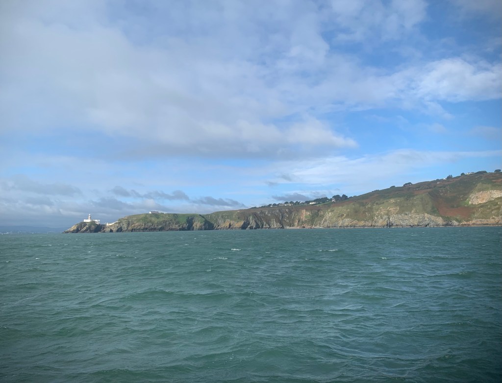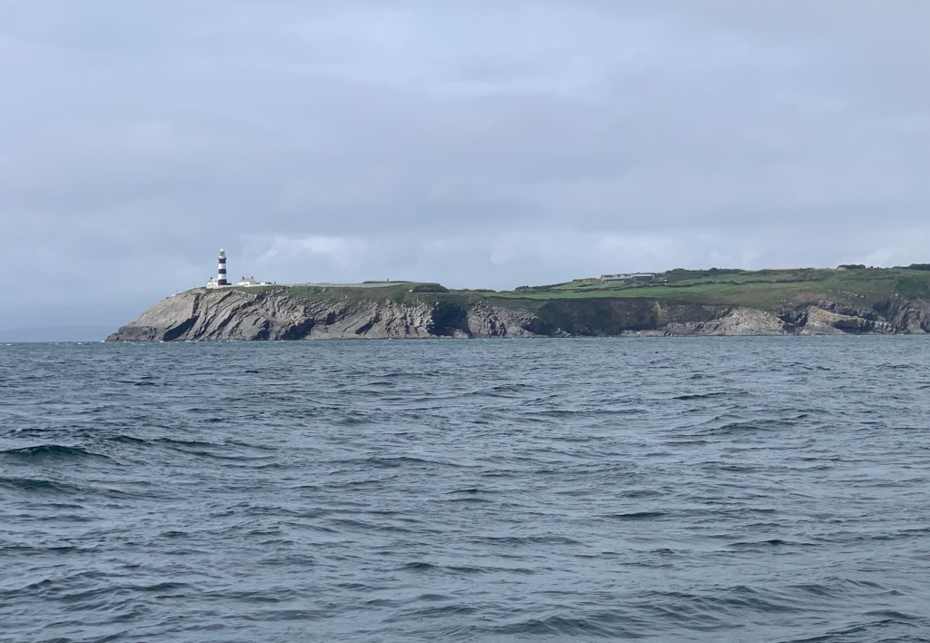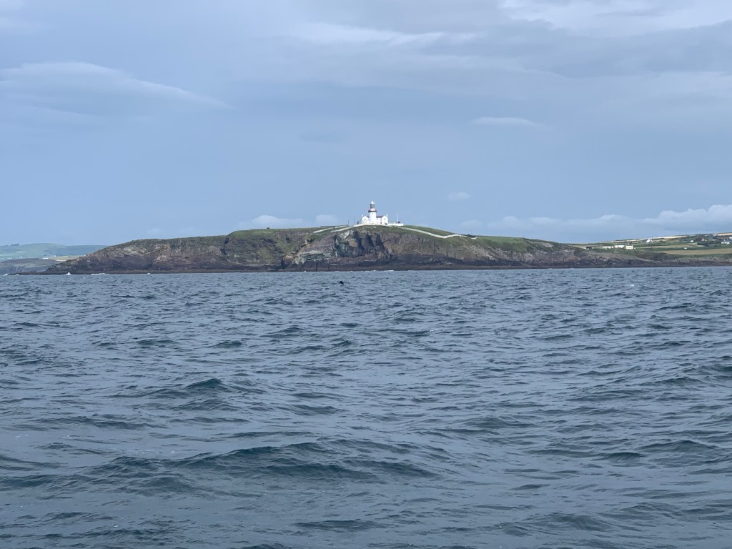 We’d been at the Royal Cork, Crosshaven for a week of adverse winds, too strong winds or downright foul stormy weather; we’d meant to stay just one night. The ladies in the office were lovely extending our stay each day. Finally departed last Wednesday afternoon after the storm on Tuesday though we probably shouldn’t have – we hit a big swell as soon as we were out of the shelter of the Owenboy river, the seas were mountainous off the harbour entrance, some of the worst we’ve been in anywhere. We set just the small staysail to run eastwards along the coast, this gave us plenty of speed to get to the corner as the tide turned in our favour. But in the middle of the night the wind dropped, the sea calmed and we ended up motoring round the SE corner of Ireland and Tuskar Rock light and up the Irish Sea. All day in calm and sunshine as we motored north we heard a succession of small craft warnings for strong winds out out by the Irish Coast Radio stations – very surreal. The wind was just getting up as we anchored at midnight near Dalkey Island on the south side of Dublin Bay for a few hours sleep. We realised how sheltered our anchorage was when we left first thing next morning to cross a very choppy Dublin Bay, dodging the big tankers and ferries going on and out, then the few miles round the corner to the nice sheltered marina at Howth. And our early arrival gave us time to explore the town. Howth, apart from the smart yacht club, is all about fish – a plethora of wet fish/ fish and chip and Seafood restaurants all along the harbour. There are also some lovely cliff walks. Now waiting for weather (again) to carry on north.