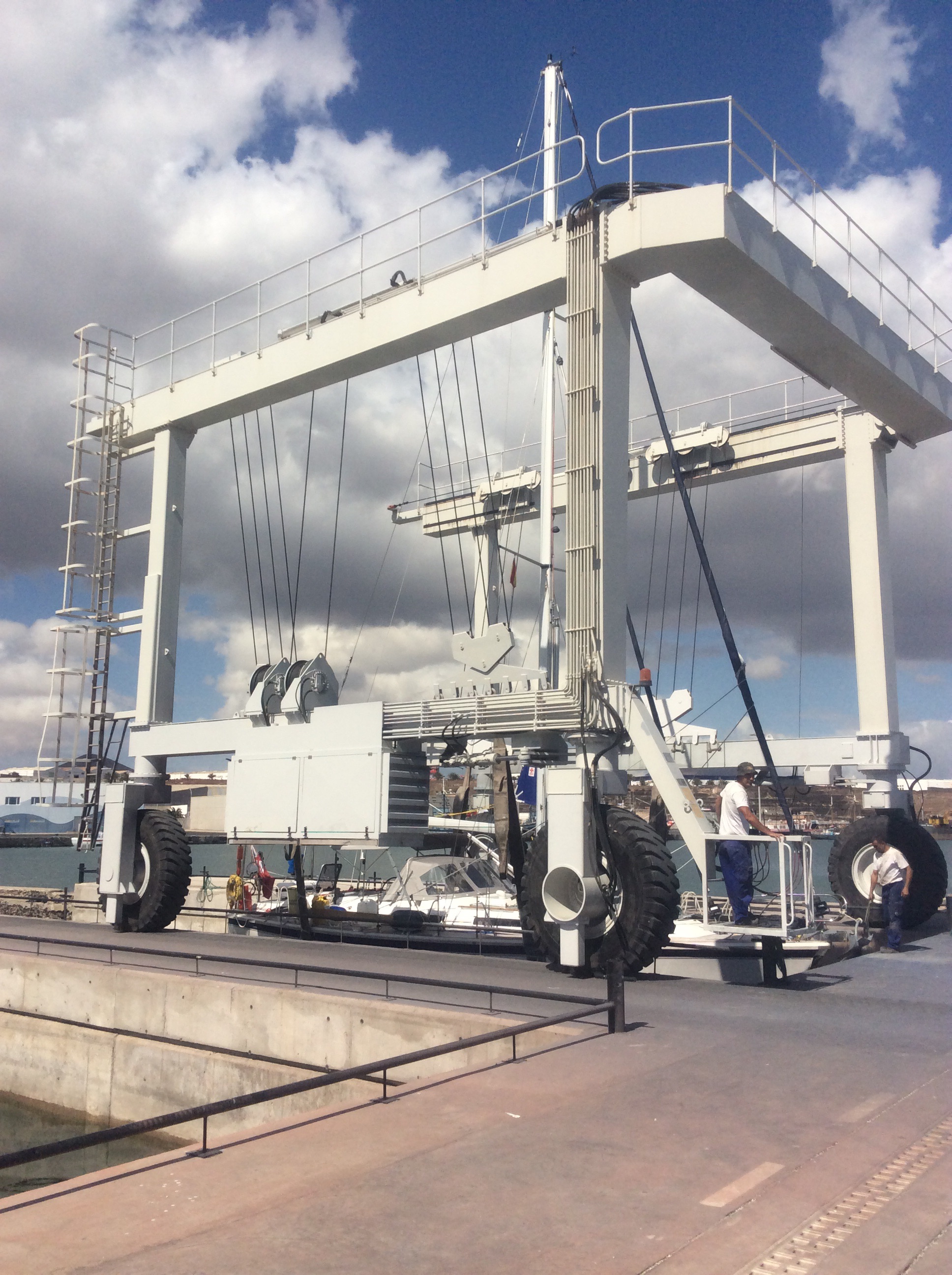 Timshel was lifted out of the water on Wednesday for the rudder bearings to be fixed. They used the small travel hoist which seemed normal size to us, but they also have an absolutely humungus one (but strangely there do not seem to be any cradles to put boats into?). Luckily she was only out of the water for a few hours and stayed in the slings until she was relaunched. Steve took the opportunity to clean the hull a bit and change an anode, but in fact there was only a little slime on the hull, it was remarkably clean, so either the Coppercoat is doing its work or the fish in the marina have eaten off any fouling. It was very disappointing to have to get more work done on the rudder, given that it had been done before we left the marina in Scotland, and we’d waited almost a month for the work to be done. In retrospect it felt a bit stiff when we left, but we assumed this was just because the bearings were new, after all it had been fixed by the experts what did we know. We spend so little time actually steering the boat we had not quite realised how stiff and immovable it had become. Happily it is now much better and the new autopilot has been fitted to replace the one that had given up the struggle with the immoveable rudder and died.