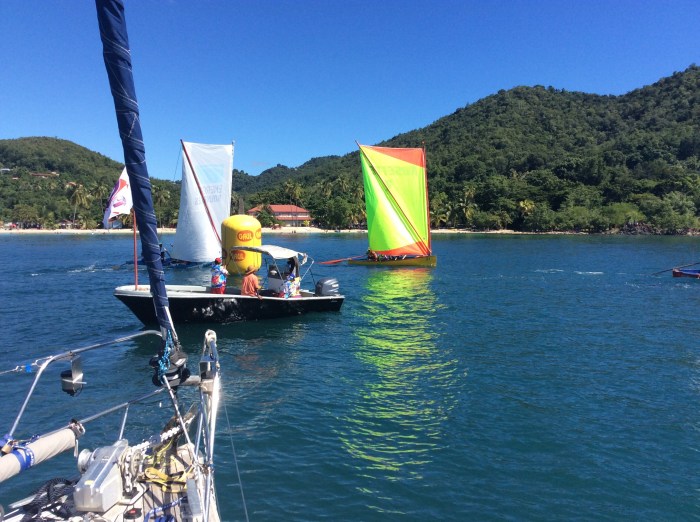 Marin is a very busy yachting port. We moved to a more scenic anchorage for the weekend. On Sunday morning we found ourselves with rather a too good a view of the local Yole racing (see pic). These local boats had quite high-etc square sails and 3 to 6 guys in the crew energetically paddling when required to supplement the sail and get up to windward, or hanging right out off the side on outriggers to balance the sail. We had been sitting peacefully at anchor having been ther all night and with the appropriate day mark (a black ball) displayed when the launches laid a huge racing mark right off our bow – well about exactly where our anchor was, making it difficult to move anyway. They didn’t come to speak to us at all, but after the start of the race seemed to be indicating it would be better if we moved back a bit, so we let more chain out to drop back away from the buoy. All fine for the first pass, but then they were coming back from the other direction uncomfortably close. So before they started the next race we got the anchor up and moved across the bay to St Annes. Luckily it was just clear of the buoy, but we were practically touching it as we got up the anchor.