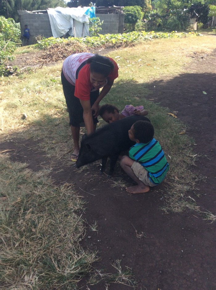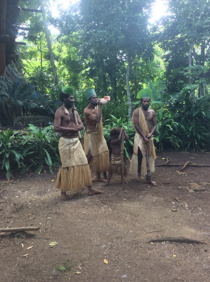 It is about 450 miles from Musket Cove Fiji to the island of Tanna, Vanuatu. We had a good trip, unusually the wind was on the beam or often forward of the beam rather than behind us. It was also quite strong at times and we made good time. Vanuatu used to be called the New Hebrides, there are a total of 83 islands and Captain Cook was here in 1774. Uniquely the islands were once jointly administered by the French and the British. Apparently there are 110 local languages, but people mostly speak English or French and a sort of pidgin called Bislama. We arrived at Port Resolution (named after Cooks ship), a pretty Bay with black sand and hot springs on one side. At times you can see the glow of the Volcano Mount Yasur from the anchorage. The area was devastated by cyclone Pam in 2015 and World ARC has been working with the village by Port Resolution. We were given a list of what the village needed – this included 4 wheelbarrows, 3 guitars, Machetes , Various tools, fishing gear etc. We had a tour round the village and the surrounding area, they have beautiful gardens, flowers, then a trip to see the Volcano at sunset which was awesome. First you feel the pressure wave then you hear the thump and then see the shower of red lumps of lava shooting up in the air. Next day there was the official exchange of gifts with much ceremony and singing and dancing. We presented the various tools and things that had been requested, in return we received decorated bags and huge palm baskets of fruit and veg.