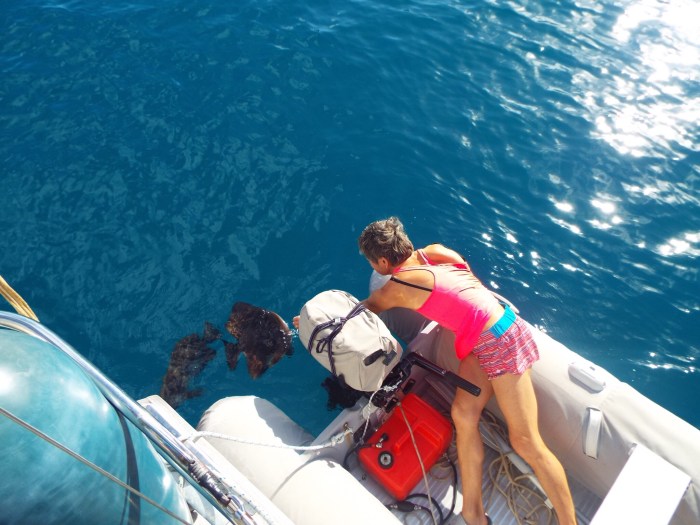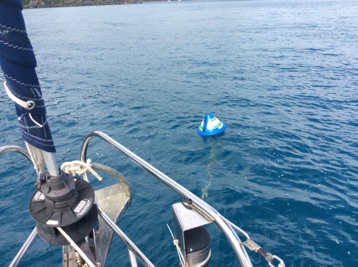 Finally managed to get our serviced Liferaft delivered back to us at Abell Point marina at Airlie Beach – it’s a long story. Restocked and set off again. The weather hasn’t been ideal, windy and rainy, but all the charter boats have to manage and so do we. It’s the trade winds season so you do expect the constant 15 to 20 knots from SE, but not the rain. We had a nice day at Blue Pearl Bay on Hayman Island where we tried out our new stinger suits with hoods and gloves attached while we went for a snorkel. Saw lots of big fish, no nasty jelly fish, but the water is quite cool and I have reverted to the wetsuit. There were huge Bat fish under the boat who come and take bread from the hand. In many of the bays Public moorings are provided which is great as it would be difficult to anchor. But they have a 2 hour time limit, which fortunately does not seem to be strictly observed just now as it’s not high season. But you can just imagine the game of musical boats as everybody moves on around the islands every couple of hours and tries not to be the ones left out when it gets to evening. Also the moorings have huge pick up ropes as thick as my arm and half the length of the boat, too big for any of our cleats, and if there is more tide than wind you end up sailing over the buoy. Some of you will be amused to note that one of the anchorages is called Stonehaven.