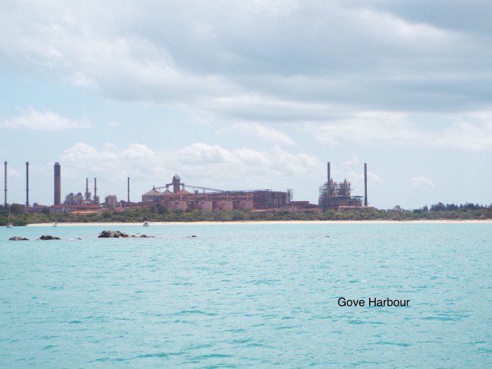 Gove is a small town maybe 3000 people in the Aboriginal lands that is here because of the bauxite (aluminium) mine. There is a metalled road to the airport otherwise dirt roads. There is also the longest conveyor in the world taking ore from the mine to the big ship wharf. It is a dry town and you need a permit to buy take away alcohol. The mining company, Rio Tinto, give a lot of support to the town, there is a 50m swimming pool, BMX track, tennis courts, golf course etc. Not certain that the Aboriginal community use many of these facilities which is sad. They have many health problems and their life expectancy which was once very high is now much lower than average. The whole of this remote north part of Australia is Aboriginal lands, but presumably the incomers didn’t want this bit. You need a special permit to go ashore in most places.