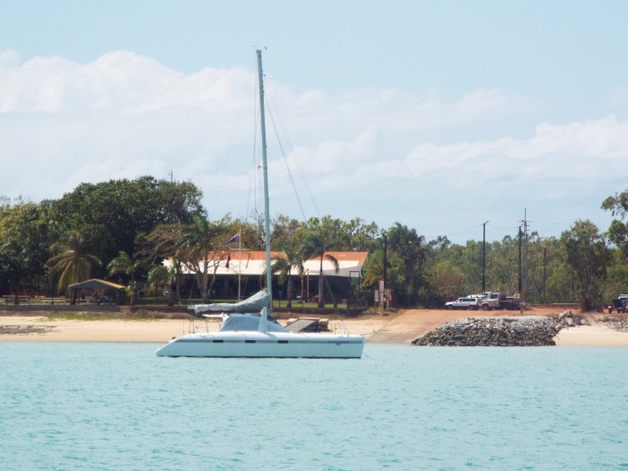 There is a thriving yacht club, Gove Boat club, just across the bay, they are very friendly and you can get temporary membership for just 10$ a week to use showers and washing machines etc, there is a bar and they do food Thursday for Sunday. Apparently there are s couple of tame crocodiles around.