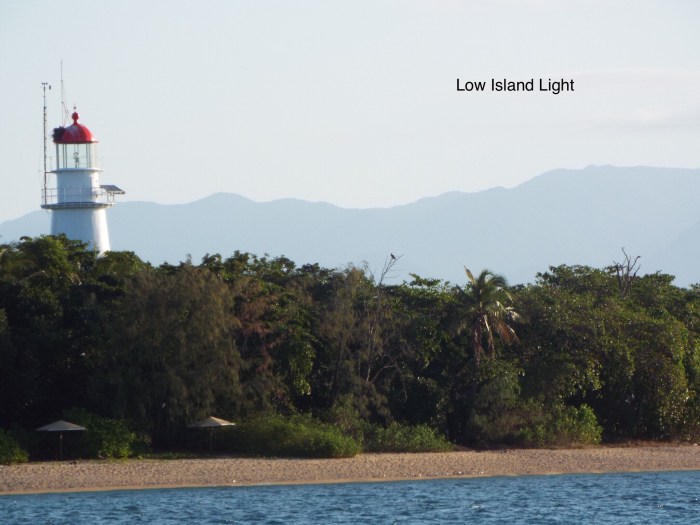 As you head up from Cairns the space between the coast and the reef gets narrower and you find yourself sharing it with big ships, the shipping channel takes up most of the room. See pictures of Pacific Aria. Fortunately there is not too much traffic. Some of the anchorages are better than others, it can be difficult to get out of the swell and small reef islands may not provide much shelter. I was prompted to reread parts of Joshua Slocum “Sailing alone around the world”. He sailed up the E coast of Australia in 1897; from Sydney he went to Bowen then Cooktown, then Thursday Island in the Torres Strait, taking just over a month to do the whole trip. He had been advised to make Day hops (as we have been doing) rather than navigating in the dark but he found the route well charted and perfectly possible to sail at night and easier for him than stopping and having to get the anchor up and the Spray underway every day. No electric anchor winches in 1897.