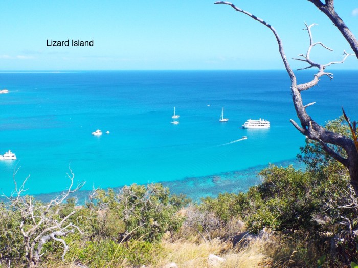 We had been told that Lizard Island was lovely and it certainly lived up to its billing. A glorious beach with wonderful snorkelling at the reef just off the beach, beautiful corals and teeming with fish small and large, including a blue spotted ray, bump headed parrot fish and a black tipped reef shark. There are also nice walks, through the mangroves and over to the Blue lagoon which is the alternative anchorage for those with local knowledge. Anita climbed the hill, quite a steep rocky path, to Cooks lookout, apparently he went ashore briefly and climbed up to spy a way out of the reefs (having already put Endeavour on one and been some weeks at what became Endeavour river and Cooktown making repairs). Certainly a superb view from the top. There is an airstrip and small resort on the island, the rest being National Park. We didn’t bother with the resort as the crew of Shalen that we’d met en route had investigated and found they were not open to Yacht people. Shalen (Oyster 53) is a refugee from the Oyster World Rally.