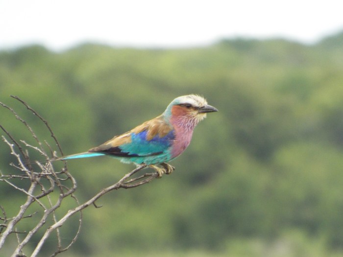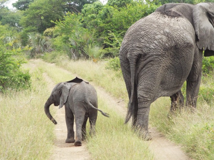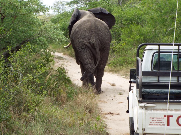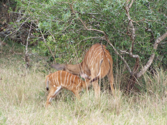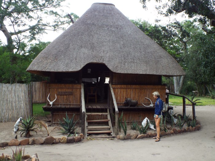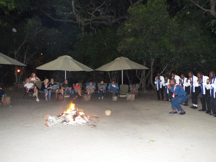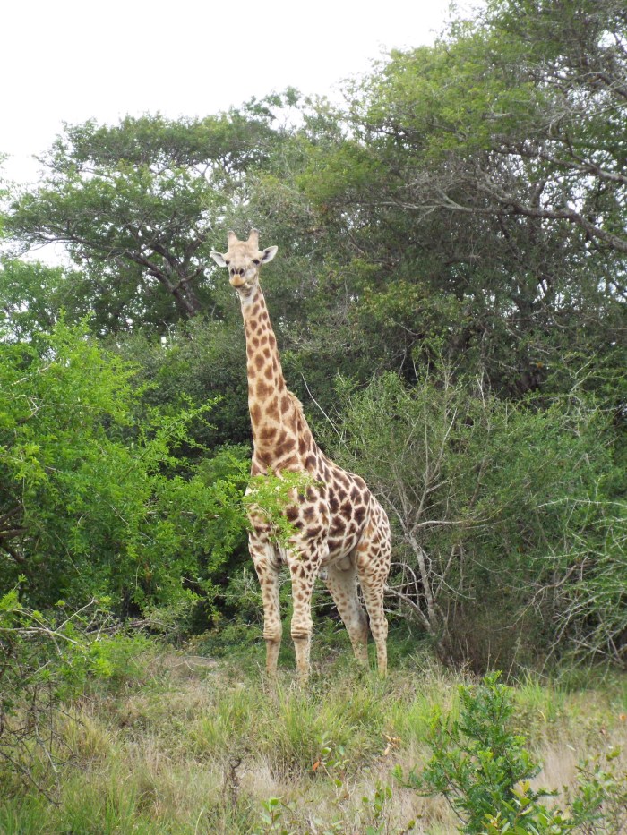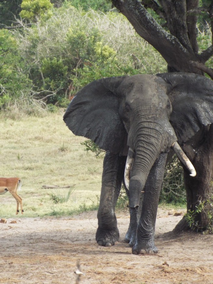 So pleased to have found this lovely place. The package was 2 nights accommodation, 2 game drives and 4 meals a day, exactly what we wanted and at a reasonable price. We just kept getting tied up trying to book everything separately. And it was 3 hours drive from Richards Bay (actually a bit more as we’d chosen a less than ideal route going through a town jammed up withe Friday market) as opposed to 7 or so to Kruger. So we arrived and were shown to our luxury tent – slightly bigger than the boat, with facilities including an outdoor shower, all set off by itself in the bush so you could here all the sounds of Africa by night (and by day). Then lunch at 2 pm then our first game drive in a land rover with expert guide Amen. He showed us everything from ants to elephants, and there were lots of elephants really close sometimes. Also zebra, giraffe, buffalo, lots of different antelope and a lioness. We saw tracks of leopard, heard roars of lions, but the rhino here are very shy. Amen seemed to have superpower vision spotting animals from an impossible distance; he also showed us a great variety of African birds. Back for dinner, called by a drum for 7.30 pm, the food was excellent and the attentive staff made us feel so welcome. The lodge is run by and for the local Tembe tribe. A log camp fire was lit in the middle of the open sitting area each night and you could watch nocturnal bush babies coming down for pineapple. Monkeys however were discouraged with a catapult. Up at 5.15 next morning for “light breakfast” before the next 3 hour game drive at 6. The 4 th meal is a substantial 2nd breakfast when you get back, then sleeping/lounging/ reading/ taking a cooling dip in the tiny pool until lunch. We loved it all so much we stayed an extra day.