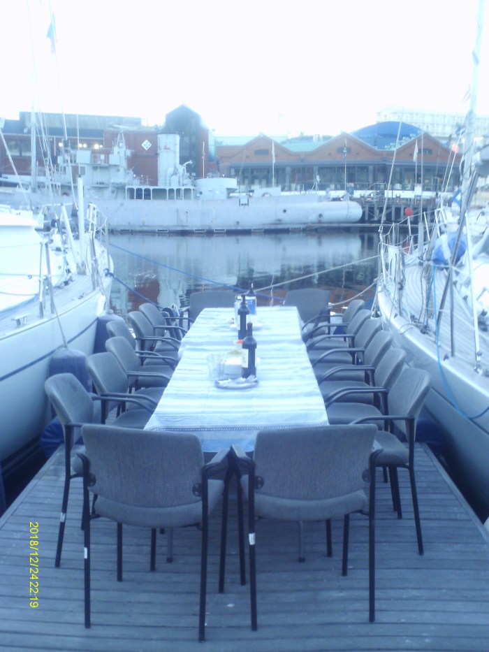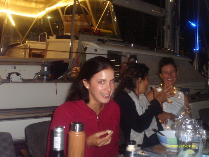 John and Angela from Madrigal organised a pot luck Pontoon party. The marina lent tables and chairs so we could have a sit down meal with Johns wine and the dishes everyone brought. The dining area was set up on the very wide finger between Madrigal and Mad Monkey to keep out of everyone’s way. It was a bit tight – no one fell in but one chair did (hastily fished out before it sank). A great time was had by all, and the carol singing did get a bit loud as the evening went on.
