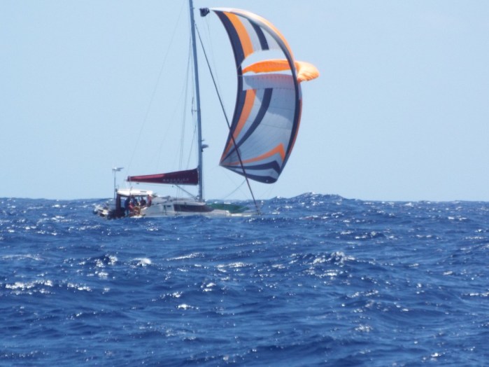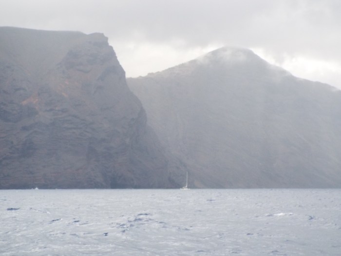 Just by chance, we got quite a good start out in Table Bay and were sailing nicely towards Robben Island when disaster struck. Our Raymarine instruments started to check out one by one, presumably some failure of communication between them; of course we have some paper charts, an independent GPS and AIS and even a sextant,but at this early stage it seemed most prudent to head back in and try to get them fixed. We got the details of an electrician from John on Madrigal, we contacted Karl and he met us at V&A marina almost as soon as we tied up again. Then he was through the boat like a whirlwind, ceiling panels don all over the place, declaring it must be “the backbone”. The offending bad part was located and fixed and we were able to set off again that afternoon following 1 bridge opening behind Airpower. Out in the bay again we met Misto who’d suffered a broken bowsprit in a sudden gust, which also ripped a hole in their forward strut, so they were also returning for repairs. Looking at the weather maps it seemed advantageous to head up the West Cape coast to avoid a big hole in the wind before turning west for St Helena. But the next morning the wind went light then ahead, so we spent some days motoring or tacking slowly up the coast. Some of the faster boat went north to Walvis Bay in Namibia, we considered checking into Ludervitz to get fuel, but at this point we got a favourable forecast and headed west towards our destination instead. A few days later we heard a plea over the SSB from Pinta (Halberg Rassy 48 from Hungary) for someone to give them so fuel; both their diesel tanks were contaminated with sea water and they needed clean fuel to run the generator and keep their systems running. The closest boats were us sailing a parallel course about 80 nm to the E, and catamaran AirPower about 80 nm behind (SE). So we agreed to divert across and Airpower to attempt to catch up. A day later the 3 boats managed to rendezvous, but only after we persuaded George that he had to stop and wait as Pinta was going faster than the two craft trying to assist. There was 20 knots of wind and a big sea, somehow Airpower (who had rather more spare fuel than Timshel and trading on catamaran stability) in a fantastic display of seamanship managed pick up the fender trailed on a long line from Pinta and transfer one can of fuel, but the next attempt resulted in the line getting round their starboard prop. We agreed to sail on and try again the next day. Airpower set their Parasailor, undeterred by the fender and fuel can dragging underneath the boat – it was far too rough to consider trying to free them. George managed to get his generator running with the first portion of fuel. Next day, another mid-Ocean rendezvous, Dave and Jill on Airpower heroically managed to transfer another 20L of fuel, despite only having one engine but this time due to a miscommunication their long line was lost – let go both ends. However this was enough for Pinta to generate electricity for the remainder of the voyage. We had only stood by to render help if needed but it was a relief to be able to set sail again for our destination. Discovered to our horror a few days later that the bottom of the foil of our in mast furling gear had sheared off AGAIN. This had happened on the way to South Africa and had been welded together, now another bit had broken. Fortunately the forecast for the remainder of the passage was fairly benign so we decided our only option was to sail on with the main as it was setting more or less headsail or cruising chute depending on the conditions. Bones from Emily Morgan kindly offered to come aboard to help get the sail off as we came into St Helena. We were very pleased to have his assistance when we arrived on the Wednesday evening just in time for the island tour next day.
