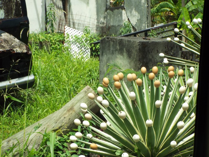 We have been to this lovely island before – Timshel was laid up ashore in a yard in the South for the 2016 hurricane season. But of course most of the time we were there we were working hard either laying up the boat or getting it ready to sail again. This time we were in the rather nice marina at St George’s for a week. We had a really good island tour with a very informative guide, learning all about local politics, conservation, agriculture and why this is called the Spice Island – nutmeg and other spice trees in integrated forests with fruit trees such as Mango, coffee and cacao. Also visited a spectacular waterfall and had a swim in the pool, some also jumped in from a height but nothing like the local guy who somersaulted in from much higher rocks (for tips). The egg shells on the cactus plants outside a home are apparently meant to ward off zombies. Then there was the Rum tour, and later the Prizegiving dinner. Timshel was awarded a share of one of the fun prizes (guessing number of characters in names of first 10 boats to finish).