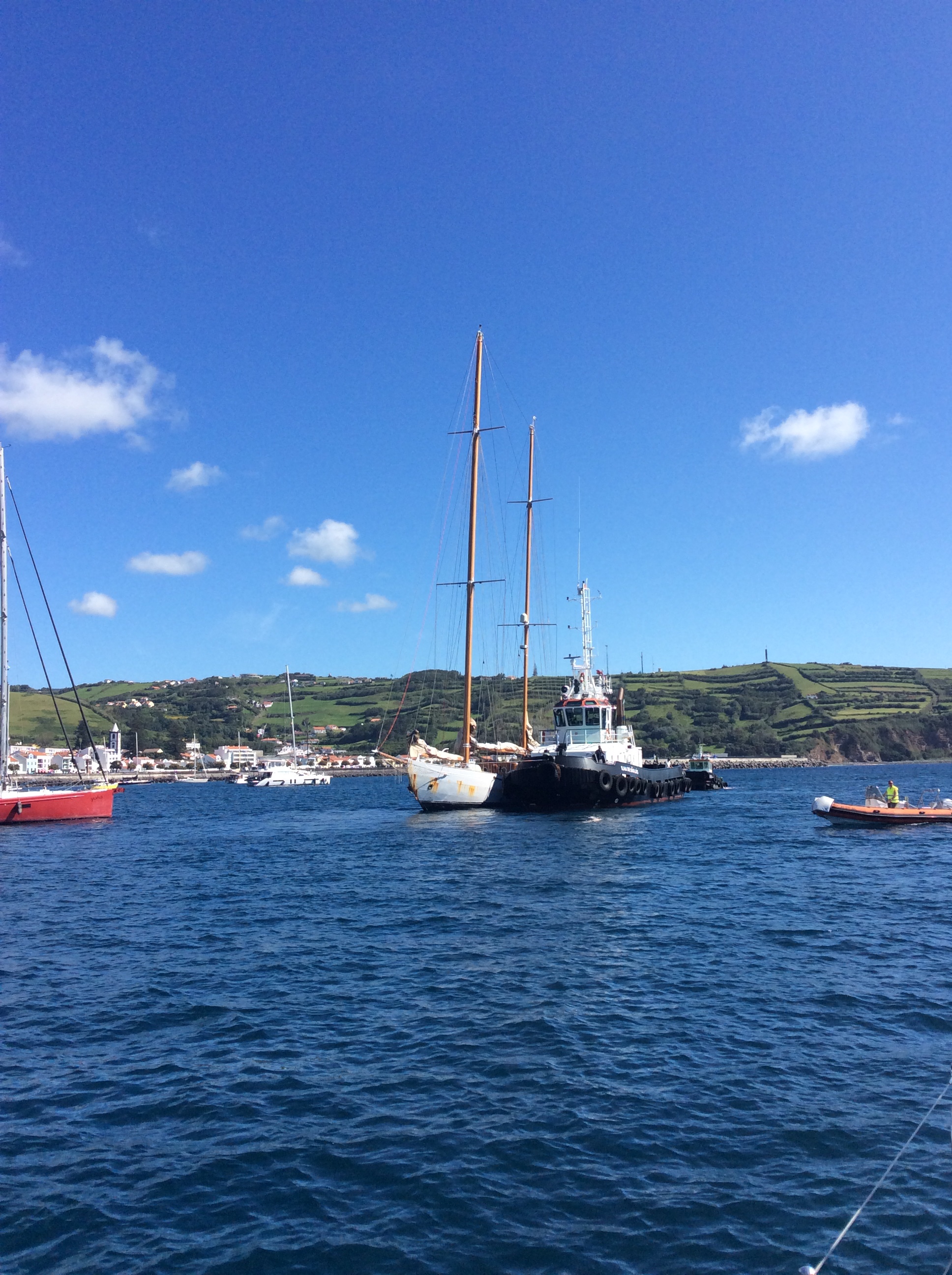 We had light winds to start with, but once past Anguilla we headed north east on a close reach. We checked in on the nightly Ocean Cruising Club SSB net so at least we had some “virtual” company, including some boats whom we had already met via “Messenger” who were setting off at almost the same time from the French part of the island – Mojito, New Dawn. Weather router Chris advised there was no benefit in going a long way north so we continued NE. Little wind became no wind and we drifted slowly, I think we had every possible point of sail, on many days we only logged 70-100nm as were making only 3 knots and distance made good towards our destination was sometimes much less. Then more wind which soon went ahead then too much wind from ahead gave us a very wet and rough ride as we sailed as close to the wind as we could, had just two short periods when we made good progress in the correct direction then no wind again. Saw 1 whale, 2 pods of Atlantic Spotted dolphins, White tailed Tropic Birds, Laughing Gulls, Shearwaters (on arrival) and flocks and flocks of Sailing jelly fish, presumably Portuguese Men o’War (fortunately they did not seem to sting that badly as they were all over our Aquair towed generator). But we had a great downwind sail for the last 3 days, and sunshine as we romped along the coast of Faial. We arrived in Horta and anchored in the harbour on a sunny Sunday evening after 24 days and 4 1/2 hours, Total distance 2705 nm, Motoring hours 42.3, including getting out of Sint Maarten and into Horta. We used something like 110L of diesel, some of which would have been for the generator. We could no doubt have been quite a bit faster if we had motored more when it was calm (but as it is we used nearly half our diesel). We checked in with the marina on VHF (one thing they needed to know was the age of the crew).