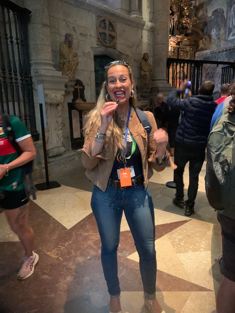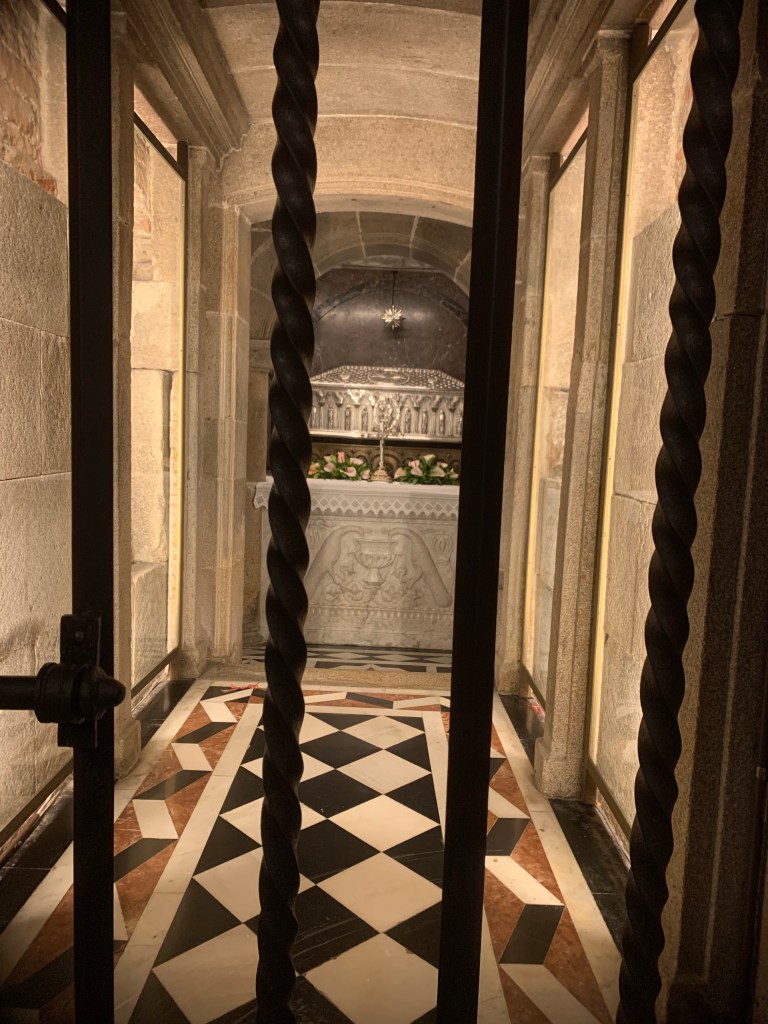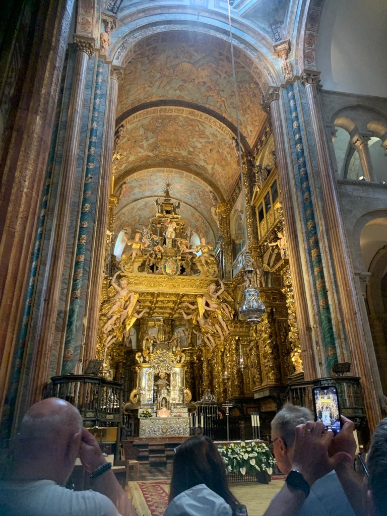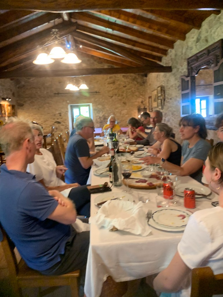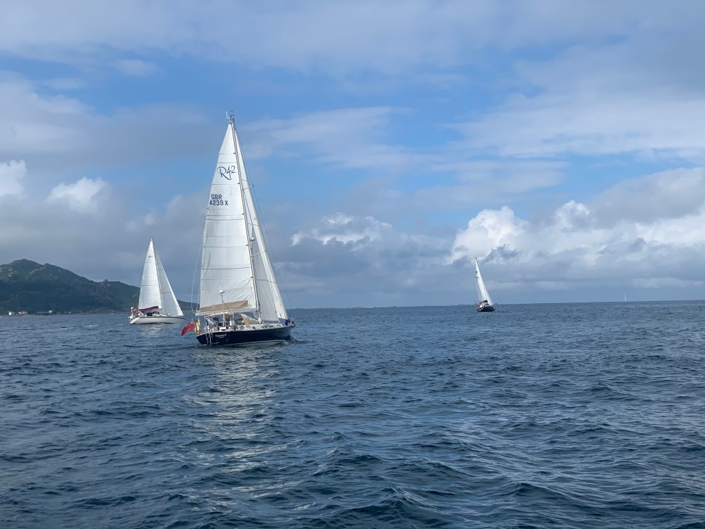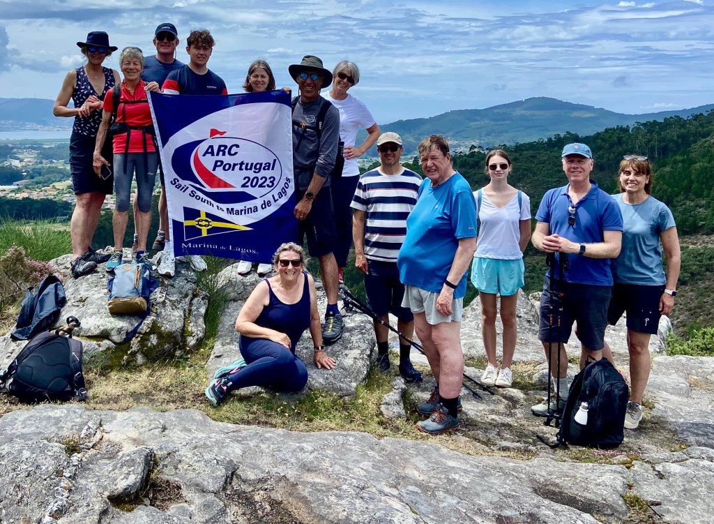 Oeiras: North bank of the Tagus, a bit downstream of Lisbon and rather a nice marina – well the only one that had brought us fresh bread in the mornings anyway. The local tour included the historic gunpowder factory, the Poets Park (nice but no idea about any Portuguese poets) then an interesting wine tour and tasting – they have started a heritage vineyard and winery to avoid losing their local tradition. We went to the World Heritage site at Sintra on the local bus. It’s a fabulous place, up in the hills do much cooler, and you could easily spend 4 or 5 days going round the various palaces and castles and other sights and doing walks. We chose to walk to the Old Town via the Sculpture trail and go round the Historic Palace of Sintra, ignoring the blandishments of multitudes of folk wanting to take you on bus tours, horse drawn carriage tours, Tuk Tuk yours etc. With transportation no doubt you could get round more attractions but sometimes it’s nicer to just do it yourself. Anyway the Palace was wonderful, everything labelled in English, Portuguese and Japanese so no problem. The most amazing ceilings; and the strange looking white chimneys turned out to be the special flues for the huge kitchens, the palace being built to entertain hundreds of people. After the palace and gardens we had a nice lunch and eventually the clouds parted enough to at least get a picture of the Moorish castle on the mountain top. The last day in Oeiras was mainly spent doing jobs such as glueing up the headlining (it comes down in the heat), putting up the Bimini that we hadn’t used for 3 years, organising the navigation for the next leg and lastly painting our boat name on the harbour wall – a very rush job done while it was blowing a gale, so it won’t win any prizes in the competition. I had time for a 2 minute swim (it was lovely) before we went for dinner.
