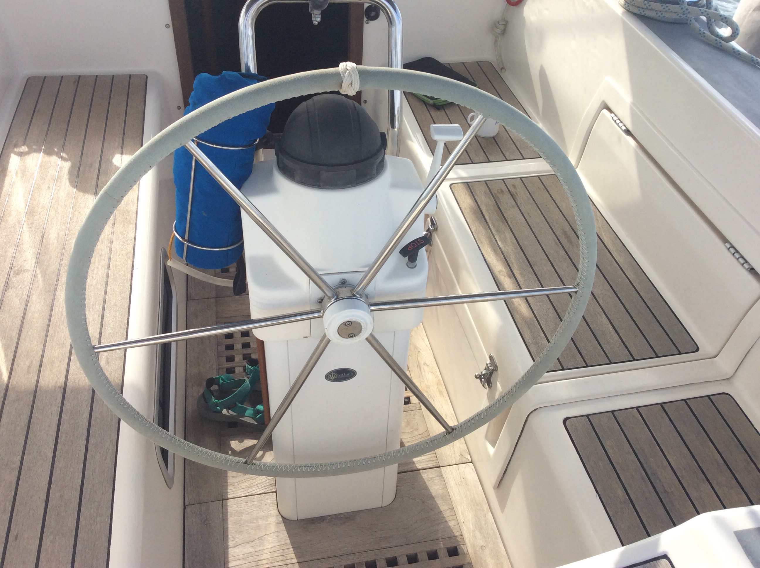 As usual we read a lot of books. We did manage to do some boat jobs e.g sewing on the new wheel cover we had been carrying around for years, plus some small mending jobs with sewing machine and revarnishing some of the worst bits of the interior. It seems that wood customarily gripped by salty, sun tan cream covered suffered significant degradation. The Dan buoy got a new flag. It was difficult to be inspired when you were stuck. And of course you had to have the materials for the job already to hand as the shops were closed, the varnishing stopped when the can of varnish we had was finished. As the time when we might leave approached we did apply ourselves to check the boat over (Steve hoisted me up the mast) and generally get organised.