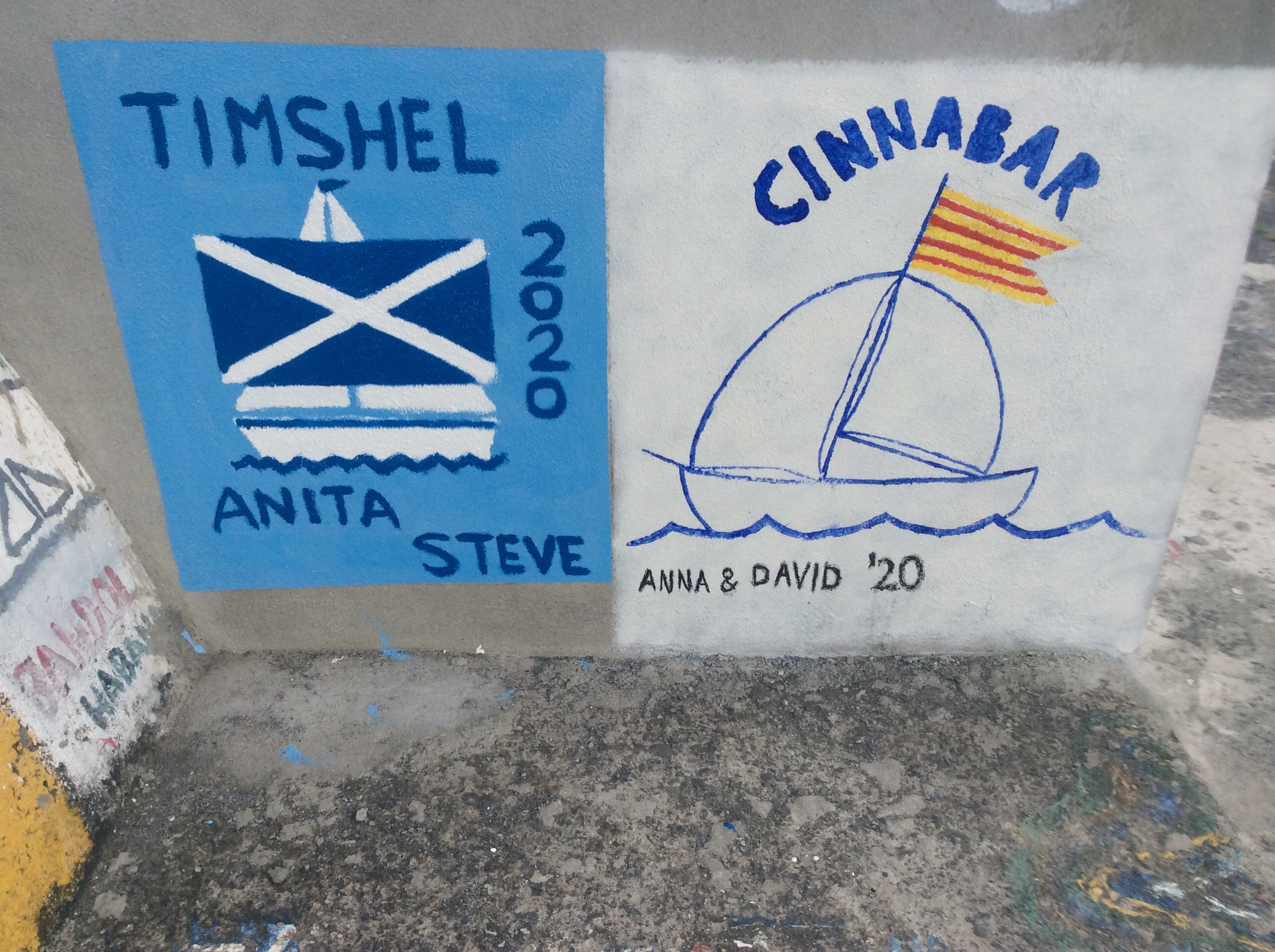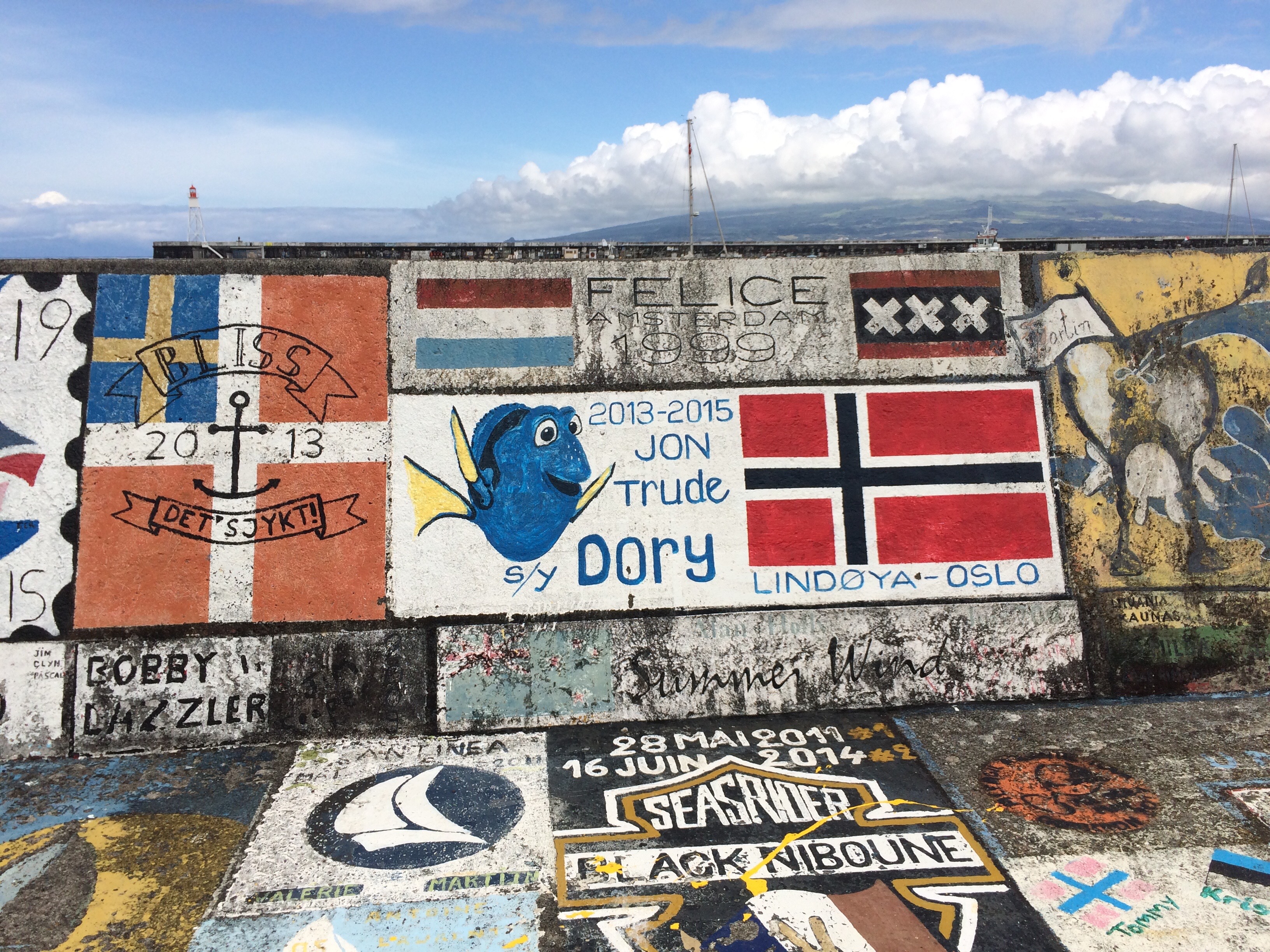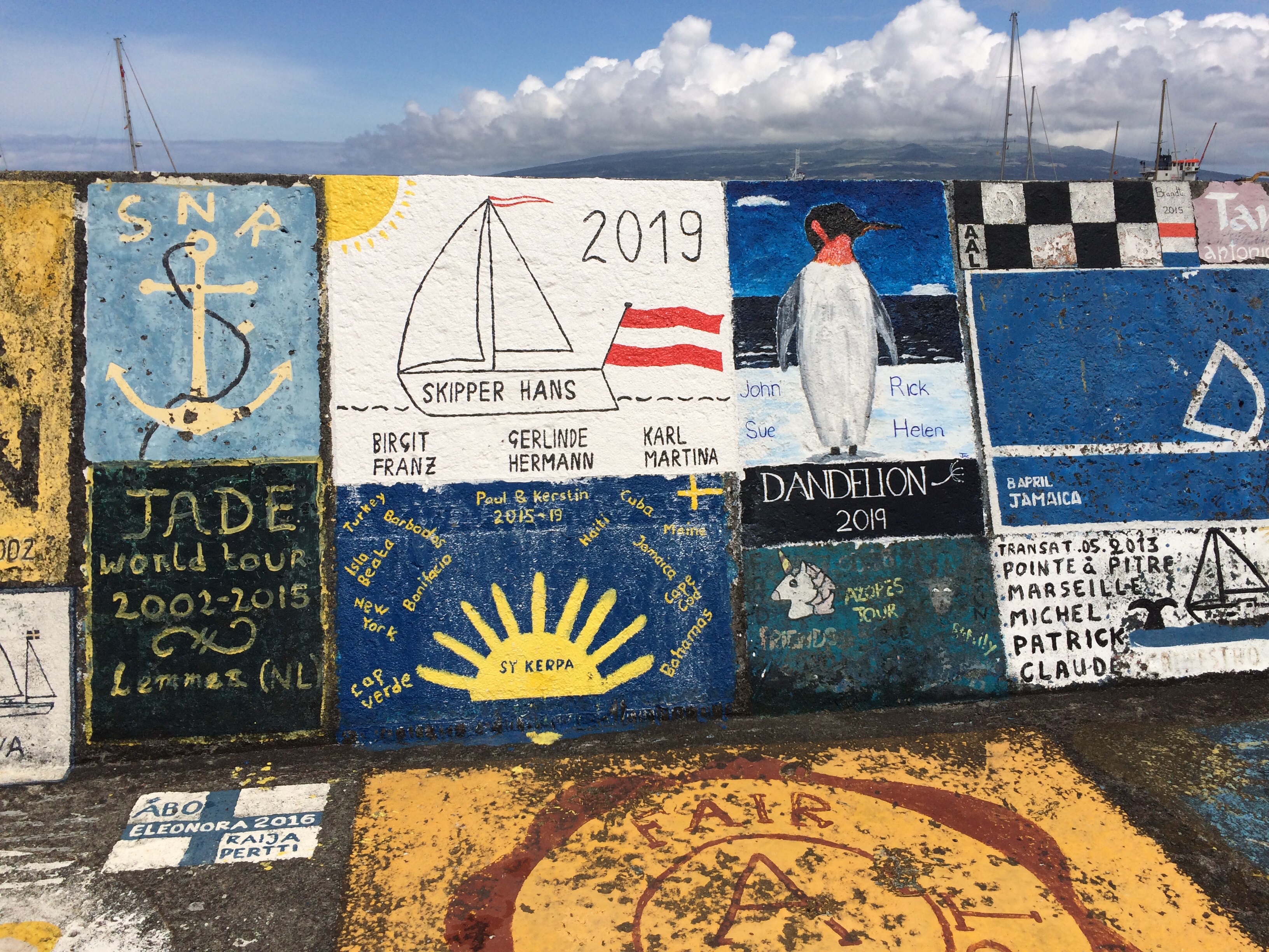 HORTA is a very attractive city. White walls, red tiled roofs, black and white churches. Masks are required when going inside anywhere, seating marked out for social distancing etc, but otherwise people seem relaxed. There are no recent cases and as the airport is closed, all the visitors have arrived on small yachts having been isolated on board for 2 or 3 weeks of the ocean crossing before they arrive and all have a negative Covid test. Not everywhere is open, but you can go to the famous Peter Cafe Sport. Anita can run over 2 volcanic cones just near the City, Monte Queimado and Monte de Guia. As is traditional we have painted our boat name on the harbour wall. Almost every inch of the wall is populated, we chose a position on one of the new bits built to shelter the bins – these parts are rapidly being filled too.