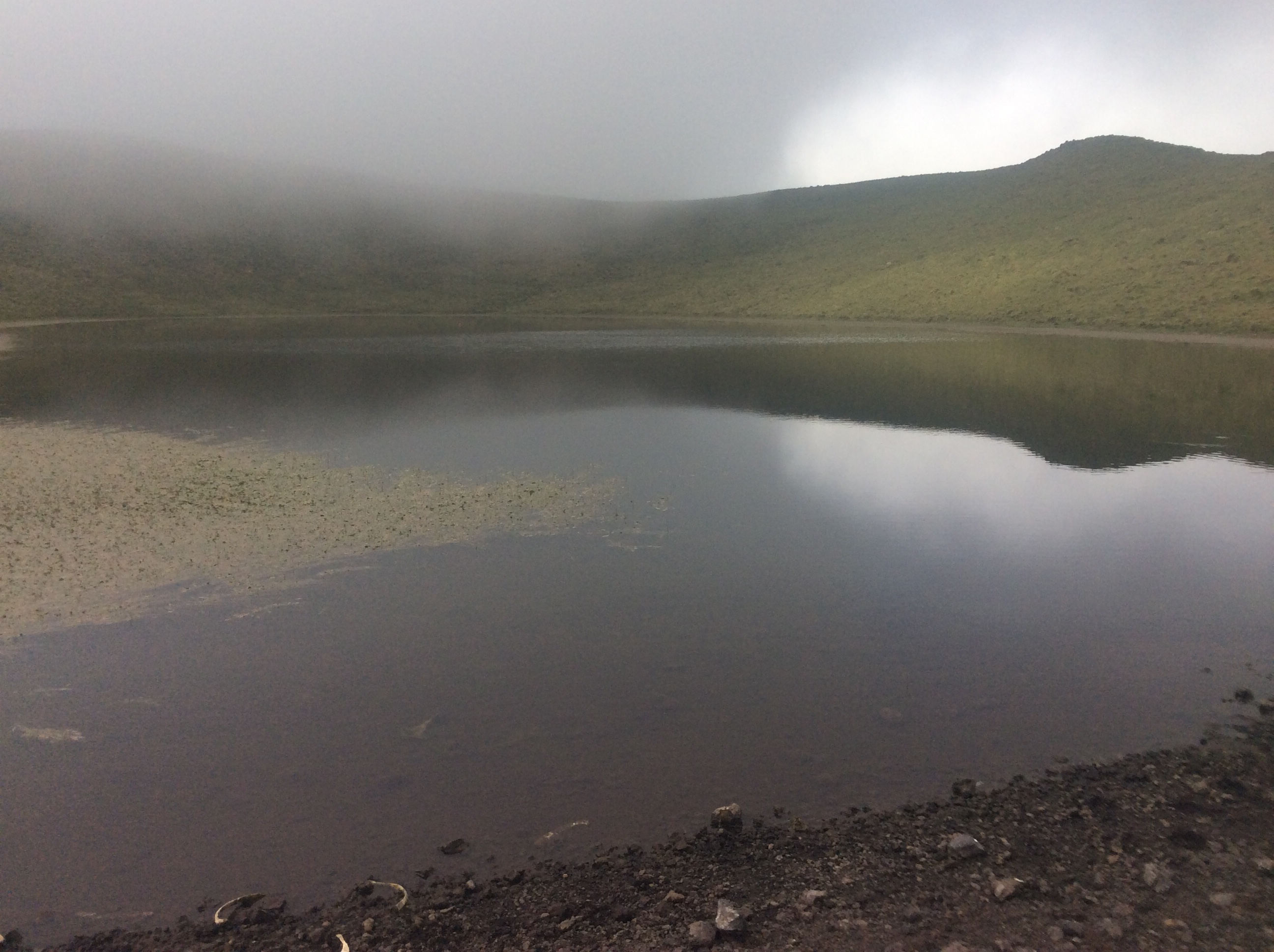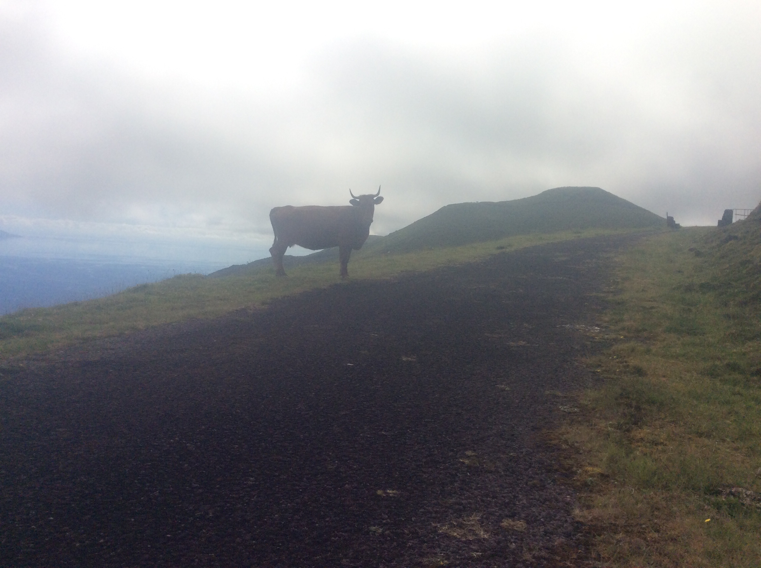 Next we drove across the centre of the island to go to the central caldeira. This may have been a mistake – there is a reasonable road around the coast but across the centre you find yourself on very small and sometimes rough roads. Unfortunately the cloud had come down. There is a path all round the crater rim, but with no visibility we just had our picnic lunch and drove down. We saw just one other car.