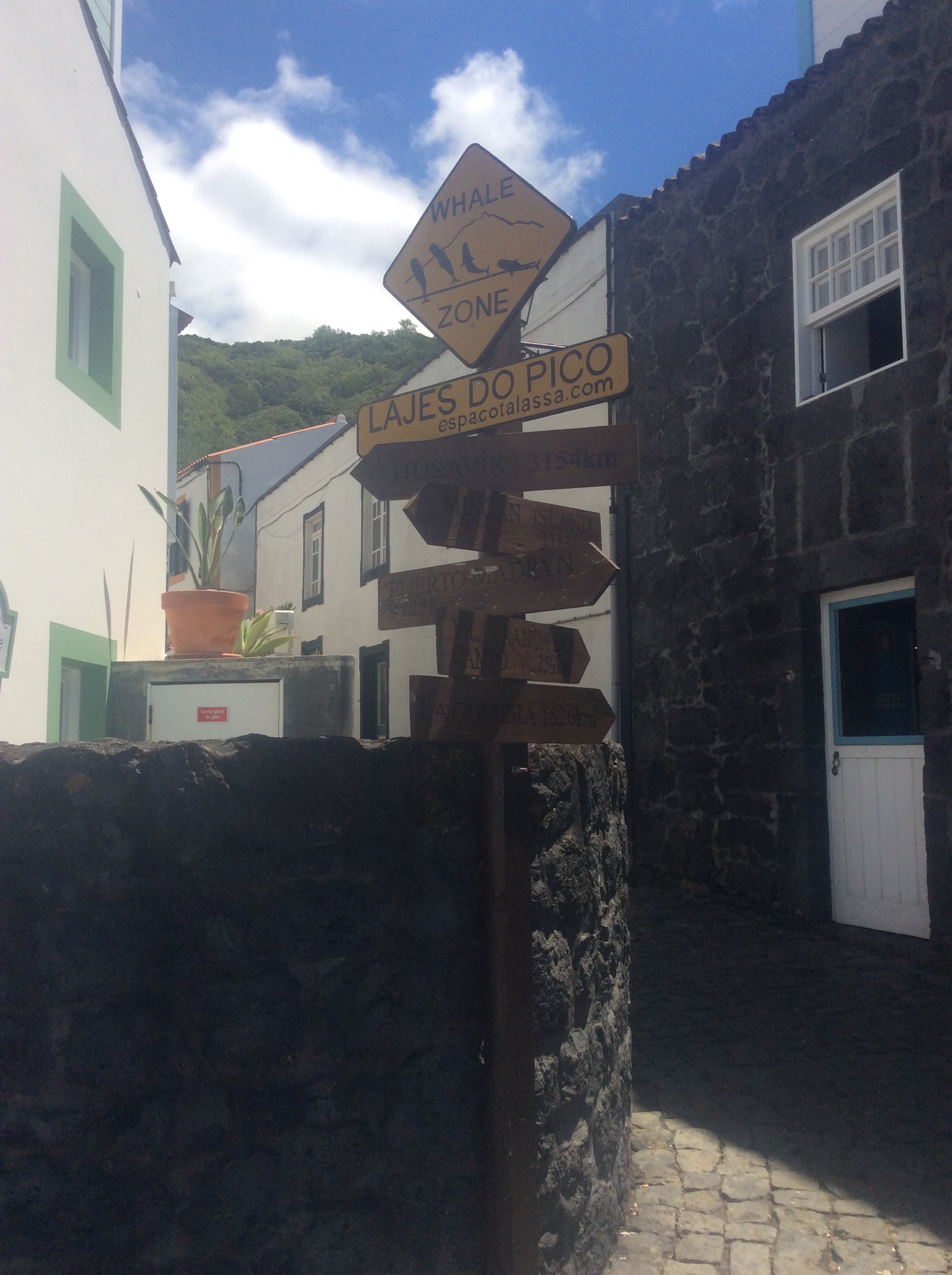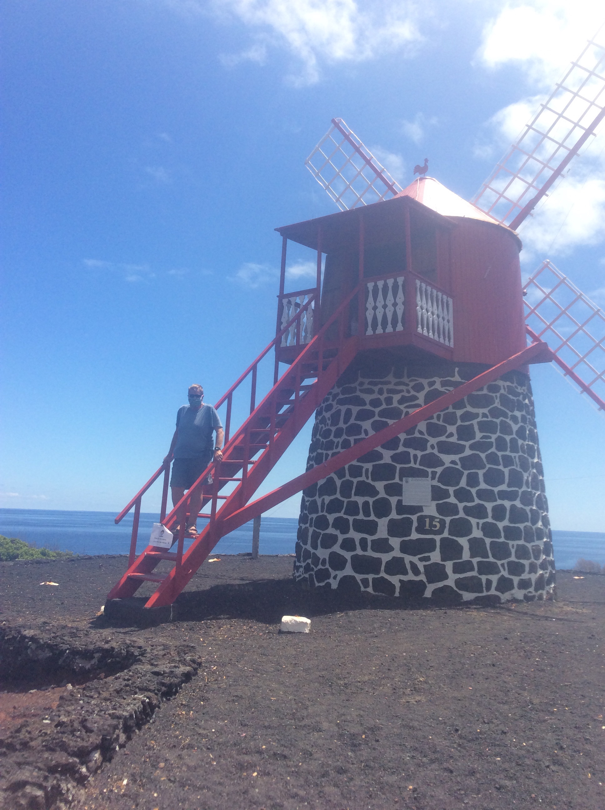 It was a lovely day so we got great views of the eponymous mountain. Inland and on the other side of the island the land is more fertile and is given over to grazing and other crops. At Lajes on the S side we went to the whaling museum. The Azores now makes more money (in a normal year anyway) from whale watching than it ever did from whaling. Timshel might just fit in the small marina at Lajes assuming that we had booked. We had a great lunch of local dishes, visited a windmill and finished up with a tour of João’s family vineyard and winery, where we were treated to samples of white and red and local cheese. All too soon we were back in Madalena to get the ferry back to Horta.