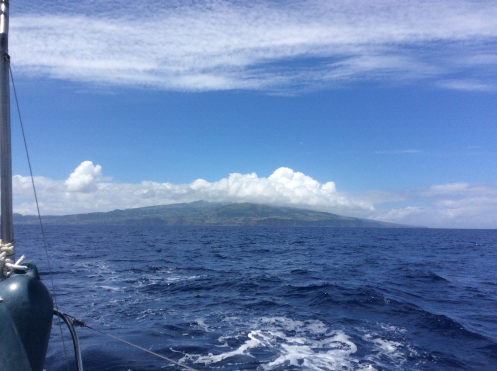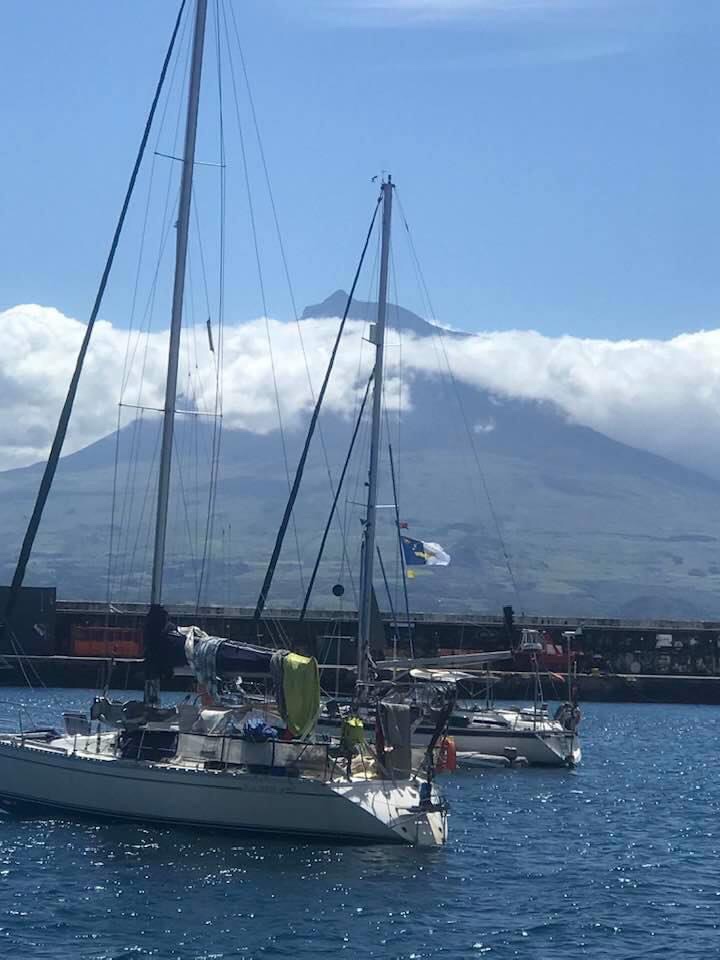 We had light winds to start with, but once past Anguilla we headed north east on a close reach. We checked in on the nightly Ocean Cruising Club SSB net so at least we had some “virtual” company, including some boats whom we had already met via “Messenger” who were setting off at almost the same time from the French part of the island – Mojito, New Dawn. Weather router Chris advised there was no benefit in going a long way north so we continued NE. Little wind became no wind and we drifted slowly, I think we had every possible point of sail, on many days we only logged 70-100nm as were making only 3 knots and distance made good towards our destination was sometimes much less. Then more wind which soon went ahead then too much wind from ahead gave us a very wet and rough ride as we sailed as close to the wind as we could, had just two short periods when we made good progress in the correct direction then no wind again. Saw 1 whale, 2 pods of Atlantic Spotted dolphins, White tailed Tropic Birds, Laughing Gulls, Shearwaters (on arrival) and flocks and flocks of Sailing jelly fish, presumably Portuguese Men o’War (fortunately they did not seem to sting that badly as they were all over our Aquair towed generator). But we had a great downwind sail for the last 3 days, and sunshine as we romped along the coast of Faial. We arrived in Horta and anchored in the harbour on a sunny Sunday evening after 24 days and 4 1/2 hours, Total distance 2705 nm, Motoring hours 42.3, including getting out of Sint Maarten and into Horta. We used something like 110L of diesel, some of which would have been for the generator. We could no doubt have been quite a bit faster if we had motored more when it was calm (but as it is we used nearly half our diesel). We checked in with the marina on VHF (one thing they needed to know was the age of the crew).