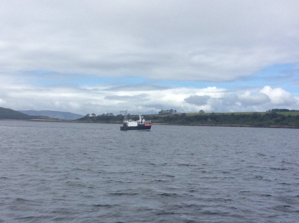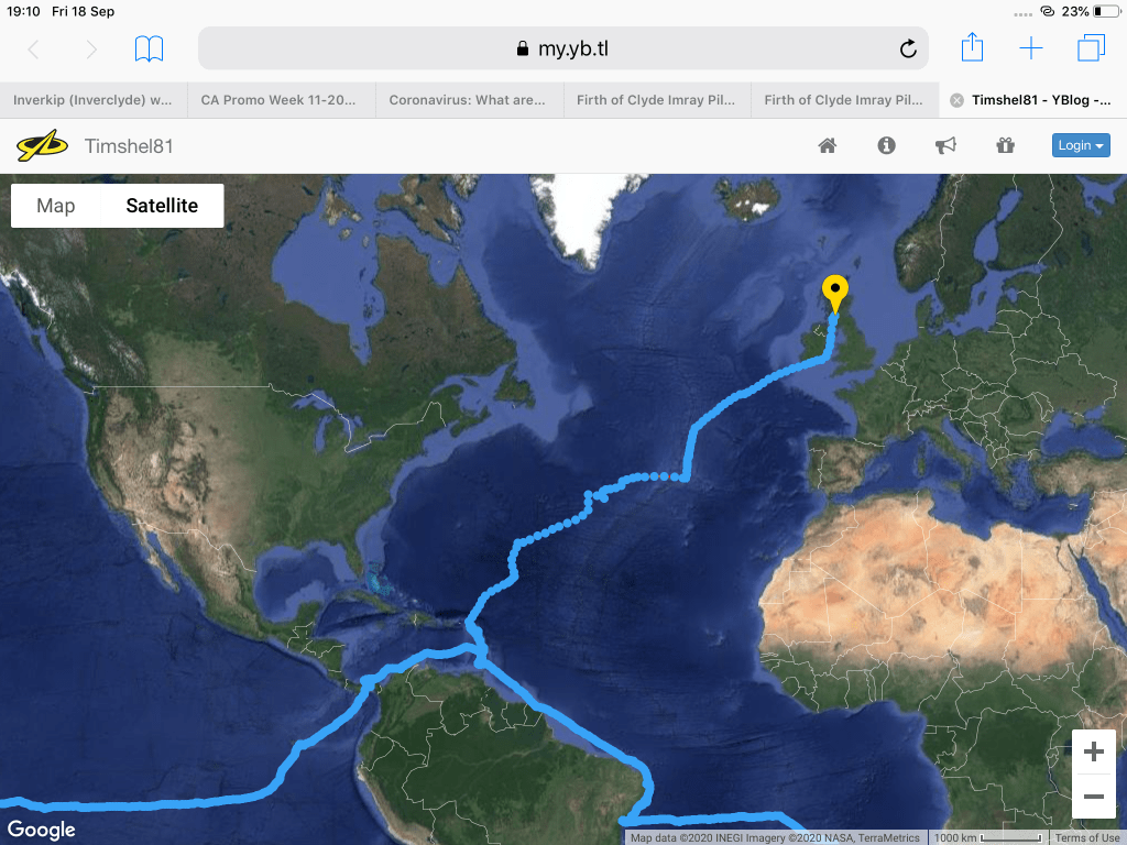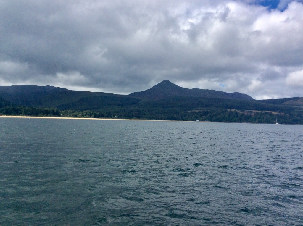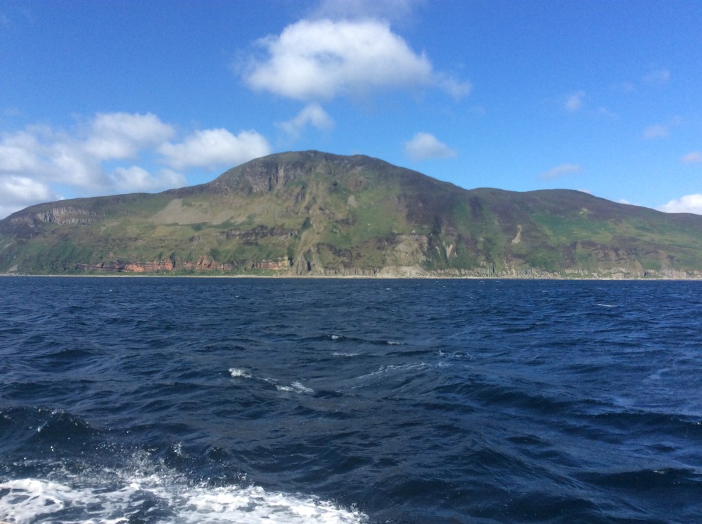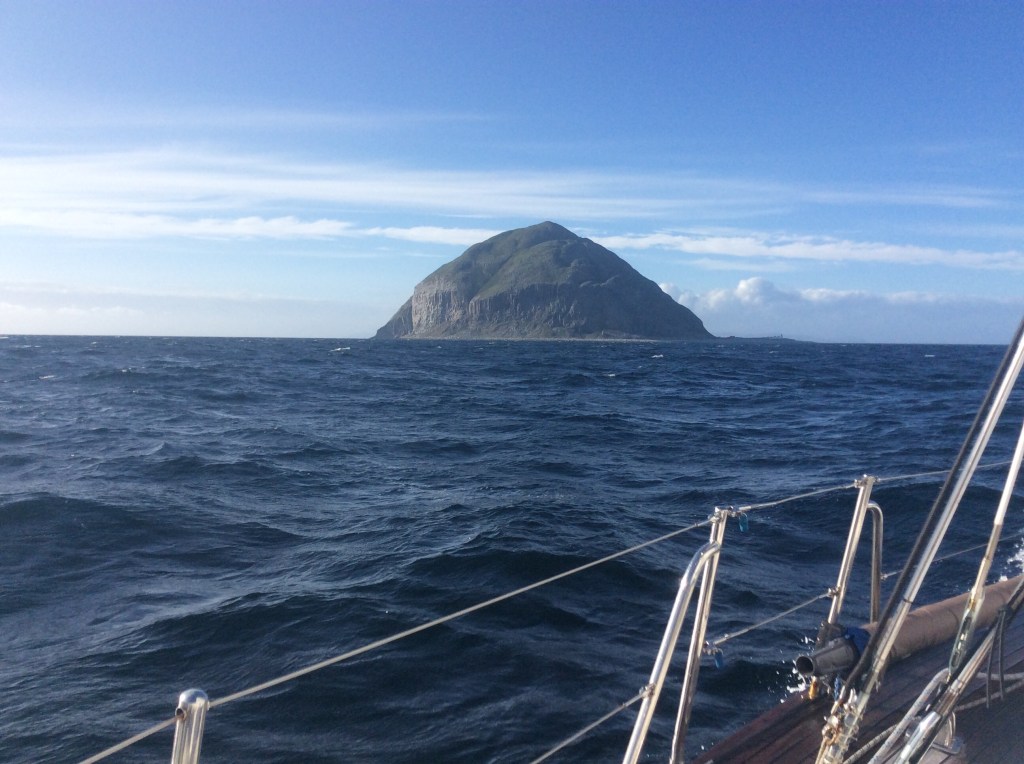 As we got closer to Ireland we started to see familiar birds – gannets, kittiwakes and later guillemots close to the coast. Landfall at Fastnet was around 2300. The weather cleared and we could see the lighthouse and above it a comet, which was a surprise as we hadn’t heard about Comet NEOWISE. It was calmer and therefore slower off the south coast of Ireland, but we had good wind up the Irish Sea until it went away at the border with Northern Ireland so we motorsailed the last part in order to catch the favourable tide in the north channel. More traffic than we are used to – quite a few fishing boats at night. Back in the Clyde there were yachts, ferries and fishing boats. We headed up past Alisa Craig and anchored off Whiting bay on Arran for the night, very strange to be at rest. No phone signal or internet there so we went into Brodick Bay in order to fill out the new Government Passenger Locator form and we phoned the Customs who weren’t that interested (though very polite and helpful) as we were coming from an EU country (Azores). Midway through this we realised that the bilge alarm was going off and the bilge was full of fresh water. This turned out to be a broken valve at the foot pump and was relatively accessible, but mopping out all the water took a while so we elected to spend another night at anchor (off Brodick Castle) before arriving “proper”.