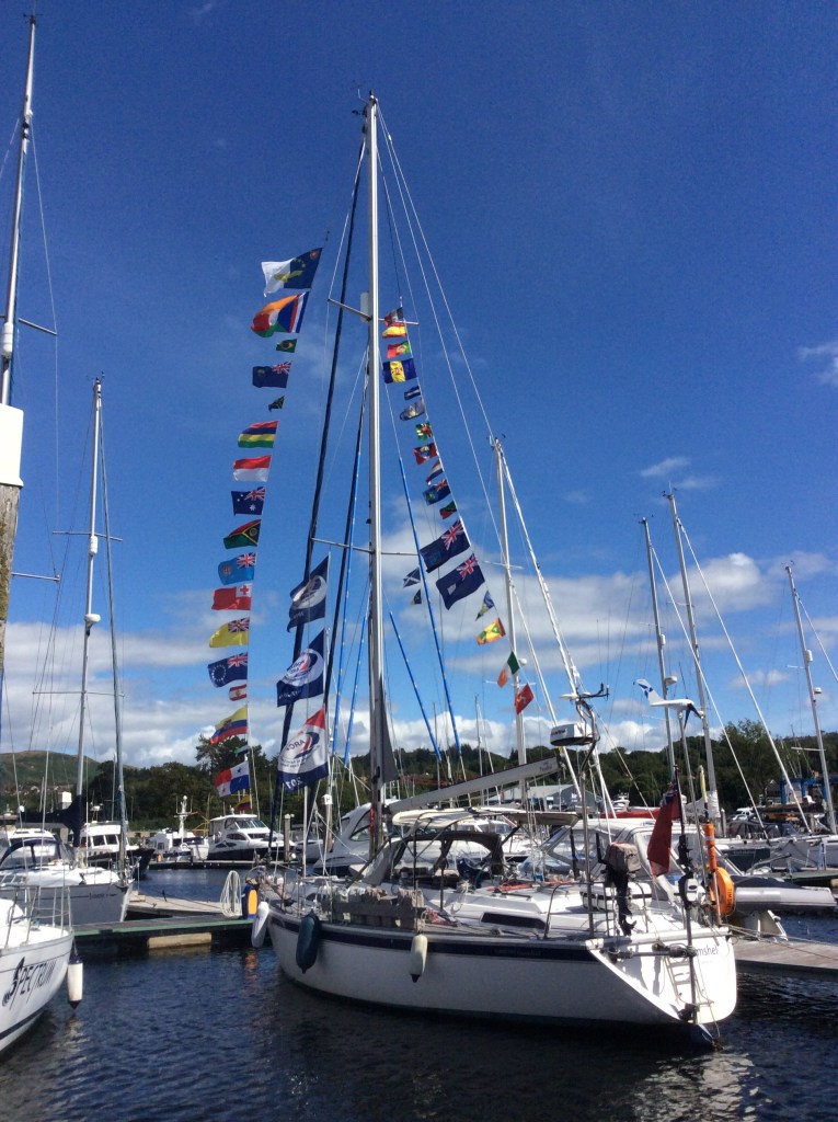 From Azores to Scotland, Timshel was 14 days on passage. Total 1605 nm, 12 1/2 days to do 1574 nm and 2 days to do the last 31 up from Arran to Inverkip. We put up all the courtesy flags from our travels around the world, and the ARC rally flags.