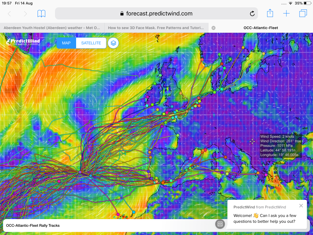 As time went on restrictions around the islands were relaxed and the hurricane season approached. All along it had been said that of course the one place you could go would be your home country/home port, just that for most boats this was several thousand miles away and a trip that would only be made in the favourable season. This is the option we chose, after all we had intended to sail home this season – with the ARC Europe rally from BVI and via Bermuda and the Azores. The rally of course was cancelled – at first they thought they might put on a modified version for those who still wanted to make the trip, but it was just not possible. Our trip would not be the sociable affair with parties, meeting old friends, visiting islands – Bermuda and the cruise around the Azores – that we were particularly looking forward to, but we would get there. We started to prepare the boat and wait for a favourable forecast, having asked our friend Chris Tibbs to do weather routing for us. It was good that things on the island had opened up a bit to enable us to get things from the chandlers (including the new cooker) and the hardware store (12 blue pool noodles to use as “baggywrinkle” on the aft shrouds), but probably also wise to leave before everything had opened up (especially the airport) in case there was a sudden explosion of cases of Covid19. We decided not to go to Bermuda as yachts were only being allowed to stop in emergency and to take on essential supplies though we did fill out the firms in case we did need to stop. The Azores although closed had opened two ports, Horta on Faial and Ponta Delgada on São Miguel where yachts could make a short stop and get supplies though not allowed ashore. We could see on Facebook that Peter Cafe Sport in Horta were cheerfully and efficiently supplying boats anchored in the harbour so we decided to make for Horta.