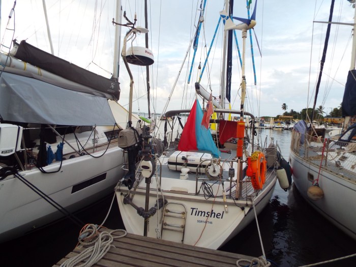 Just by chance, we got quite a good start out in Table Bay and were sailing nicely towards Robben Island when disaster struck. Our Raymarine instruments started to check out one by one, presumably some failure of communication between them; of course we have some paper charts, an independent GPS and AIS and even a sextant,but at this early stage it seemed most prudent to head back in and try to get them fixed. We got the details of an electrician from John on Madrigal, we contacted Karl and he met us at V&A marina almost as soon as we tied up again. Then he was through the boat like a whirlwind, ceiling panels don all over the place, declaring it must be “the backbone”. The offending bad part was located and fixed and we were able to set off again that afternoon following 1 bridge opening behind Airpower. Out in the bay again we met Misto who’d suffered a broken bowsprit in a sudden gust, which also ripped a hole in their forward strut, so they were also returning for repairs. Looking at the weather maps it seemed advantageous to head up the West Cape coast to avoid a big hole in the wind before turning west for St Helena. But the next morning the wind went light then ahead, so we spent some days motoring or tacking slowly up the coast. Some of the faster boat went north to Walvis Bay in Namibia, we considered checking into Ludervitz to get fuel, but at this point we got a favourable forecast and headed west towards our destination instead. A few days later we heard a plea over the SSB from Pinta (Halberg Rassy 48 from Hungary) for someone to give them so fuel; both their diesel tanks were contaminated with sea water and they needed clean fuel to run the generator and keep their systems running. The closest boats were us sailing a parallel course about 80 nm to the E, and catamaran AirPower about 80 nm behind (SE). So we agreed to divert across and Airpower to attempt to catch up. A day later the 3 boats managed to rendezvous, but only after we persuaded George that he had to stop and wait as Pinta was going faster than the two craft trying to assist. There was 20 knots of wind and a big sea, somehow Airpower (who had rather more spare fuel than Timshel and trading on catamaran stability) in a fantastic display of seamanship managed pick up the fender trailed on a long line from Pinta and transfer one can of fuel, but the next attempt resulted in the line getting round their starboard prop. We agreed to sail on and try again the next day. Airpower set their Parasailor, undeterred by the fender and fuel can dragging underneath the boat – it was far too rough to consider trying to free them. George managed to get his generator running with the first portion of fuel. Next day, another mid-Ocean rendezvous, Dave and Jill on Airpower heroically managed to transfer another 20L of fuel, despite only having one engine but this time due to a miscommunication their long line was lost – let go both ends. However this was enough for Pinta to generate electricity for the remainder of the voyage. We had only stood by to render help if needed but it was a relief to be able to set sail again for our destination. Discovered to our horror a few days later that the bottom of the foil of our in mast furling gear had sheared off AGAIN. This had happened on the way to South Africa and had been welded together, now another bit had broken. Fortunately the forecast for the remainder of the passage was fairly benign so we decided our only option was to sail on with the main as it was setting more or less headsail or cruising chute depending on the conditions. Bones from Emily Morgan kindly offered to come aboard to help get the sail off as we came into St Helena. We were very pleased to have his assistance when we arrived on the Wednesday evening just in time for the island tour next day.