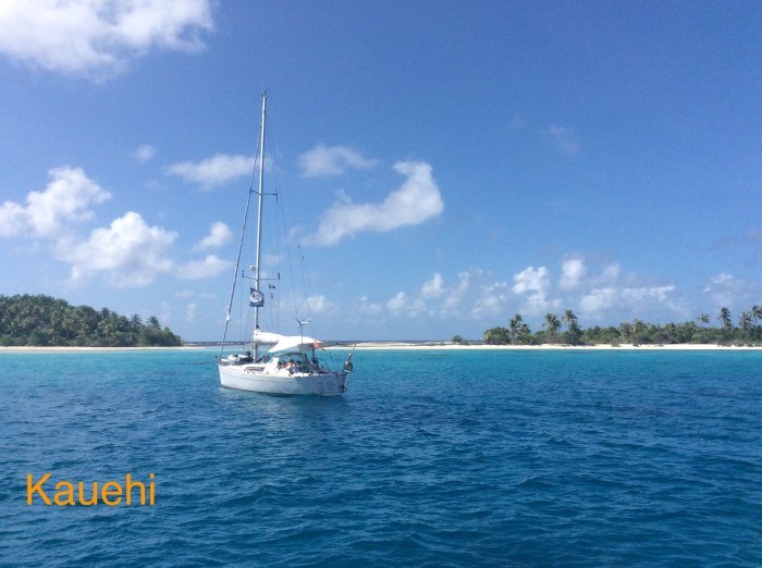 The Marquesas are high steep volcanic islands with no fringing coral reef, the first stage of island development. They are very green. After the crossing Hiva Oa seemed like a south sea oasis with gentle breezes waving palm trees – but it did rain. And you get French bread. We did an island tour by taxi looking at sites with ancient tiki statues and collecting fruits (bananas, mangoes and the huge local pampelmousse) along the way. Apart from the route to the airport the roads are little more than a track in many places. We looked at the Gaugin museum and did some shopping, a case of buying whatever was available when you saw it. Next a brief visit to the small island of Tahuata, then overnight to Taihoe Bay on Nuku Hiva for the world ARC get together where we were treated to a Sung Polynesian welcome by the village, displays of local foods, handicrafts and costumes, a traditional evening meal and dancing. We did a hike up to a waterfall and visited Controleur Bay and Taipivai, the location of Herman Melville’s novel Typee. A brief visit to the island of Ua Pou (scenic skyline) where we saw the traditional Polynesian vessel Hokulea come into port with much ceremony and celebration. The it was off to the Tuamotus, a sail of some 500 miles or so.