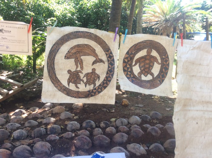 We are now in Tonga at 174 deg west so almost halfway round the world. As Tonga opted to be on the same date as New Zealand we have already crossed the international date line, so last week we had Wednesday up until afternoon tea time then it was Thursday for the rest of the day and we are now 12 hours ahead of UK. Someone in the fleet was proposing that a 180 deg celebration is just as, if not more, valid than a crossing the equator celebration so we will probably do that when we get there. Tonga is a very friendly, happy place, very traditional with men dressed in skirts (also the school uniforms), a few of the guys have embraced this look and pronounced it very cool (one even had the boat logo put on, but they have it on everything). Guess it is a tropical version of the kilt. Anyway skimpy clothes are frowned upon, you are supposed to be covered from shoulder to knee. We have been to a Tongan feast, complete with roast suckling pig and Tongan dancing. In fact there are pigs and piglets everywhere skinny ones with spots and stripes snouts but apparently they all belong to someone. There are some lovely handicrafts including the Psinted Tapa cloths. We also tried the local Kava (made from ground up root) but most were not impressed.