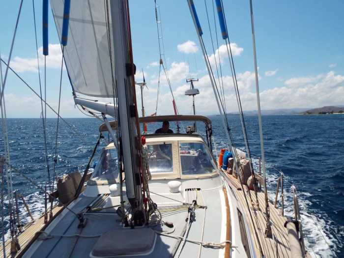We leave Lombok this morning after a whirlwind few days. It was a very slow, hot and windless passage from Darwin. Timshel does not carry enough fuel to motor for 900 miles, so after the first few days the rally fleet left us behind as they motored on, and we had to do our best to sail in very little wind. We did make the finish line just before the closing time (more than a day later than the next slowest boat), and we still had enough fuel. Luckily our timing was good for the passage up Selat Lombok between Lombok and Bali. Boats that got this wrong found up to 8 knots against them. But we benefited from the info and advice mailed back by the first boats to finish, creeping up close to the shore we benefited from a counter current of at least 3 knots. We were so touched by the amount of kindness and support we received from this new group of yachts for World ARC 2018 that we have just joined – 2 boats were even offering to go back to the Finish line to bring us fuel! This support and camaraderie between the boats is what World ARC is all about.