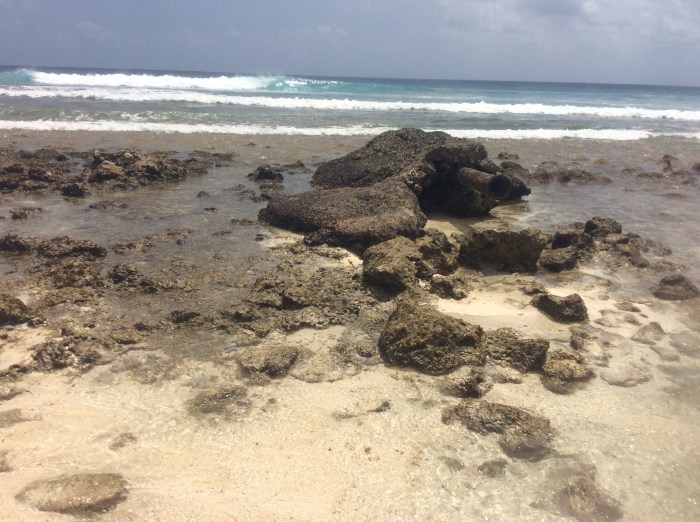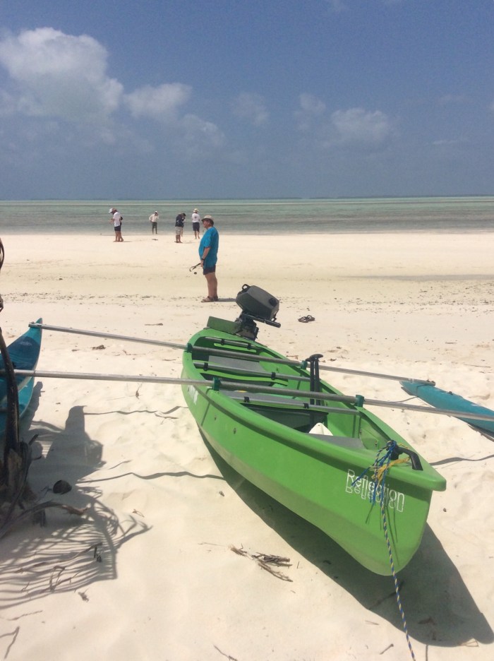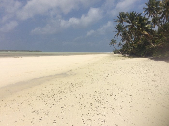 A good passage here, favourable current and almost enough wind. Here there is white sand, coral, blue sea and sky – and coconut palms! Dolphins around the boat as we came in to anchor, also reef sharks.
